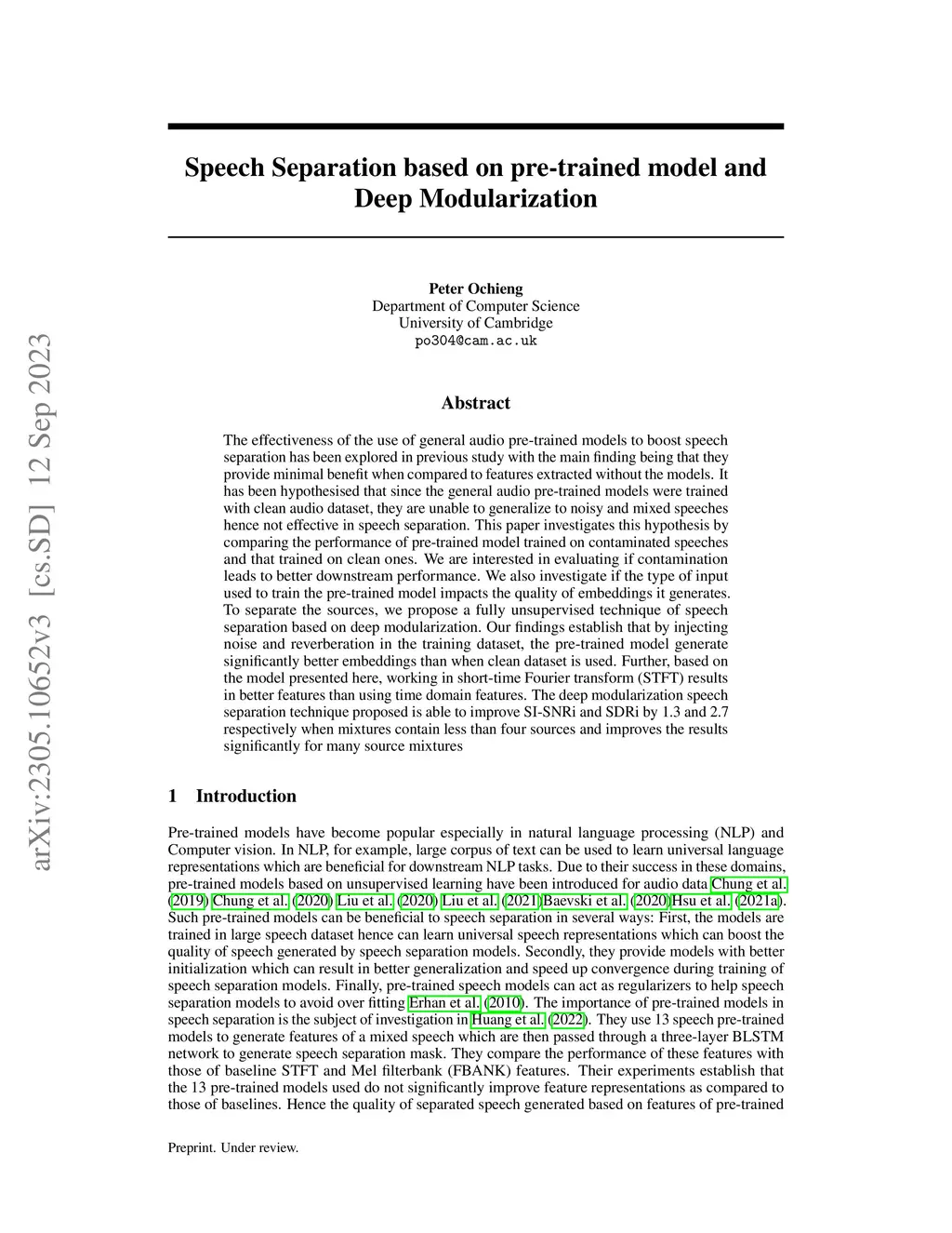 The current monaural state of the art tools for speech separation relies on supervised learning. This means that they must deal with permutation problem, they are impacted by the mismatch on the number of speakers used in training and inference. Moreover, their performance heavily relies on the presence of high-quality labelled data. These problems can be effectively addressed by employing a fully unsupervised technique for speech separation. In this paper, we use contrastive learning to establish the representations of frames then use the learned representations in the downstream deep modularization task. Concretely, we demonstrate experimentally that in speech separation, different frames of a speaker can be viewed as augmentations of a given hidden standard frame of that speaker. The frames of a speaker contain enough prosodic information overlap which is key in speech separation. Based on this, we implement a self-supervised learning to learn to minimize the distance between frames belonging to a given speaker. The learned representations are used in a downstream deep modularization task to cluster frames based on speaker identity. Evaluation of the developed technique on WSJ0-2mix and WSJ0-3mix shows that the technique attains SI-SNRi and SDRi of 20.8 and 21.0 respectively in WSJ0-2mix. In WSJ0-3mix, it attains SI-SNRi and SDRi of 20.7 and 20.7 respectively in WSJ0-2mix. Its greatest strength being that as the number of speakers increase, its performance does not degrade significantly.