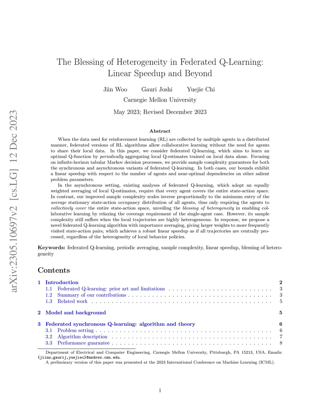 When the data used for reinforcement learning (RL) are collected by multiple agents in a distributed manner, federated versions of RL algorithms allow collaborative learning without the need for agents to share their local data. In this paper, we consider federated Q-learning, which aims to learn an optimal Q-function by periodically aggregating local Q-estimates trained on local data alone. Focusing on infinite-horizon tabular Markov decision processes, we provide sample complexity guarantees for both the synchronous and asynchronous variants of federated Q-learning. In both cases, our bounds exhibit a linear speedup with respect to the number of agents and near-optimal dependencies on other salient problem parameters. In the asynchronous setting, existing analyses of federated Q-learning, which adopt an equally weighted averaging of local Q-estimates, require that every agent covers the entire state-action space. In contrast, our improved sample complexity scales inverse proportionally to the minimum entry of the average stationary state-action occupancy distribution of all agents, thus only requiring the agents to collectively cover the entire state-action space, unveiling the blessing of heterogeneity in enabling collaborative learning by relaxing the coverage requirement of the single-agent case. However, its sample complexity still suffers when the local trajectories are highly heterogeneous. In response, we propose a novel federated Q-learning algorithm with importance averaging, giving larger weights to more frequently visited state-action pairs, which achieves a robust linear speedup as if all trajectories are centrally processed, regardless of the heterogeneity of local behavior policies.