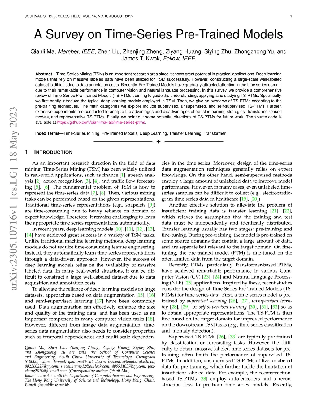 Time-Series Mining (TSM) is an important research area since it shows great potential in practical applications. Deep learning models that rely on massive labeled data have been utilized for TSM successfully. However, constructing a large-scale well-labeled dataset is difficult due to data annotation costs. Recently, Pre-Trained Models have gradually attracted attention in the time series domain due to their remarkable performance in computer vision and natural language processing. In this survey, we provide a comprehensive review of Time-Series Pre-Trained Models (TS-PTMs), aiming to guide the understanding, applying, and studying TS-PTMs. Specifically, we first briefly introduce the typical deep learning models employed in TSM. Then, we give an overview of TS-PTMs according to the pre-training techniques. The main categories we explore include supervised, unsupervised, and self-supervised TS-PTMs. Further, extensive experiments are conducted to analyze the advantages and disadvantages of transfer learning strategies, Transformer-based models, and representative TS-PTMs. Finally, we point out some potential directions of TS-PTMs for future work.