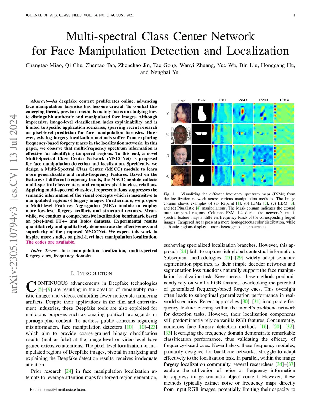 Multi-spectral Class Center Network for Face Manipulation Detection and