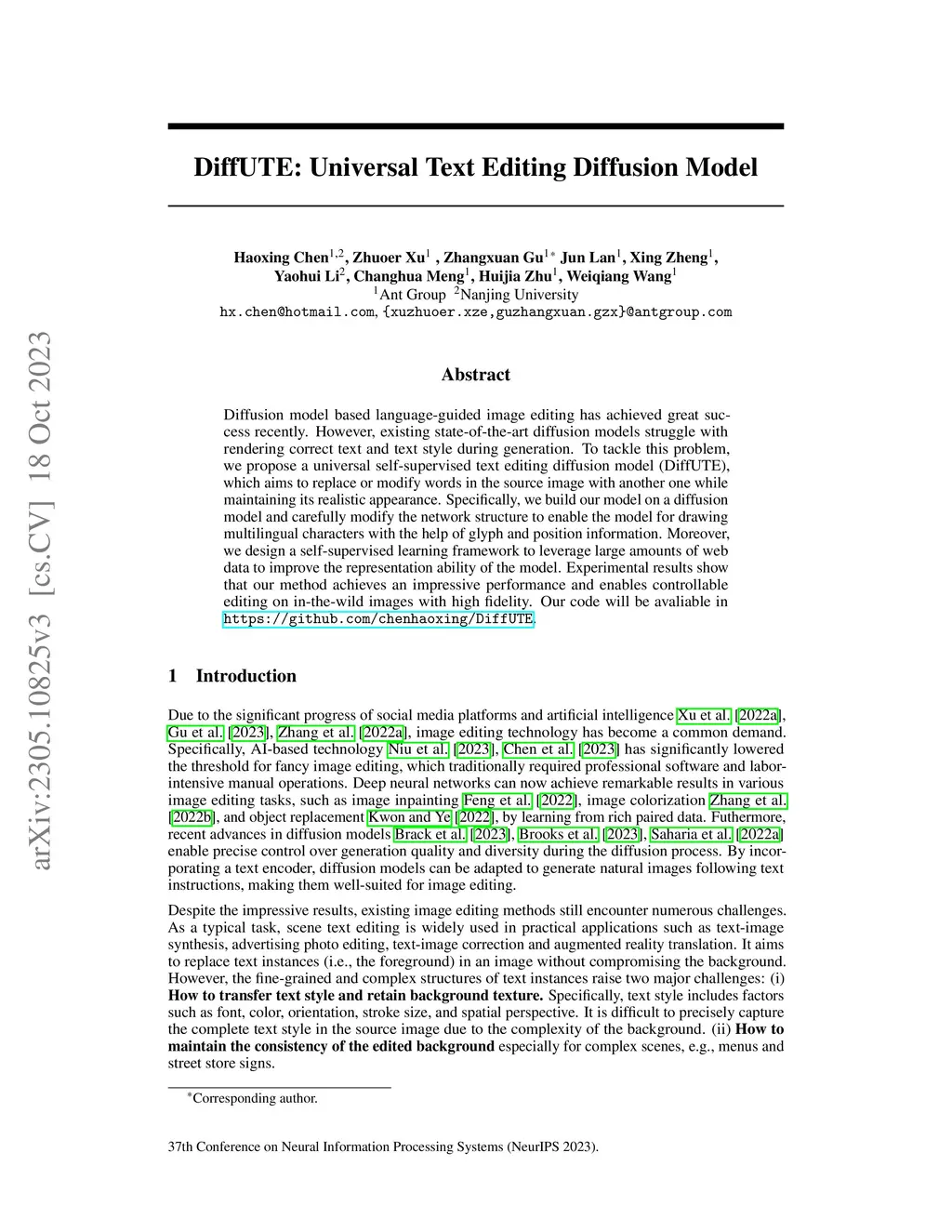Diffusion model based language-guided image editing has achieved great success recently. However, existing state-of-the-art diffusion models struggle with rendering correct text and text style during generation. To tackle this problem, we propose a universal self-supervised text editing diffusion model (DiffUTE), which aims to replace or modify words in the source image with another one while maintaining its realistic appearance. Specifically, we build our model on a diffusion model and carefully modify the network structure to enable the model for drawing multilingual characters with the help of glyph and position information. Moreover, we design a self-supervised learning framework to leverage large amounts of web data to improve the representation ability of the model. Experimental results show that our method achieves an impressive performance and enables controllable editing on in-the-wild images with high fidelity. Our code will be avaliable in \url{https://github.com/chenhaoxing/DiffUTE}.