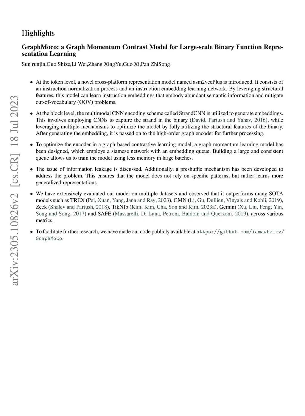In the field of cybersecurity, the ability to compute similarity scores at the function level is import. Considering that a single binary file may contain an extensive amount of functions, an effective learning framework must exhibit both high accuracy and efficiency when handling substantial volumes of data. Nonetheless, conventional methods encounter several limitations. Firstly, accurately annotating different pairs of functions with appropriate labels poses a significant challenge, thereby making it difficult to employ supervised learning methods without risk of overtraining on erroneous labels. Secondly, while SOTA models often rely on pre-trained encoders or fine-grained graph comparison techniques, these approaches suffer from drawbacks related to time and memory consumption. Thirdly, the momentum update algorithm utilized in graph-based contrastive learning models can result in information leakage. Surprisingly, none of the existing articles address this issue. This research focuses on addressing the challenges associated with large-scale BCSD. To overcome the aforementioned problems, we propose GraphMoco: a graph momentum contrast model that leverages multimodal structural information for efficient binary function representation learning on a large scale. Our approach employs a CNN-based model and departs from the usage of memory-intensive pre-trained models. We adopt an unsupervised learning strategy that effectively use the intrinsic structural information present in the binary code. Our approach eliminates the need for manual labeling of similar or dissimilar information.Importantly, GraphMoco demonstrates exceptional performance in terms of both efficiency and accuracy when operating on extensive datasets. Our experimental results indicate that our method surpasses the current SOTA approaches in terms of accuracy.