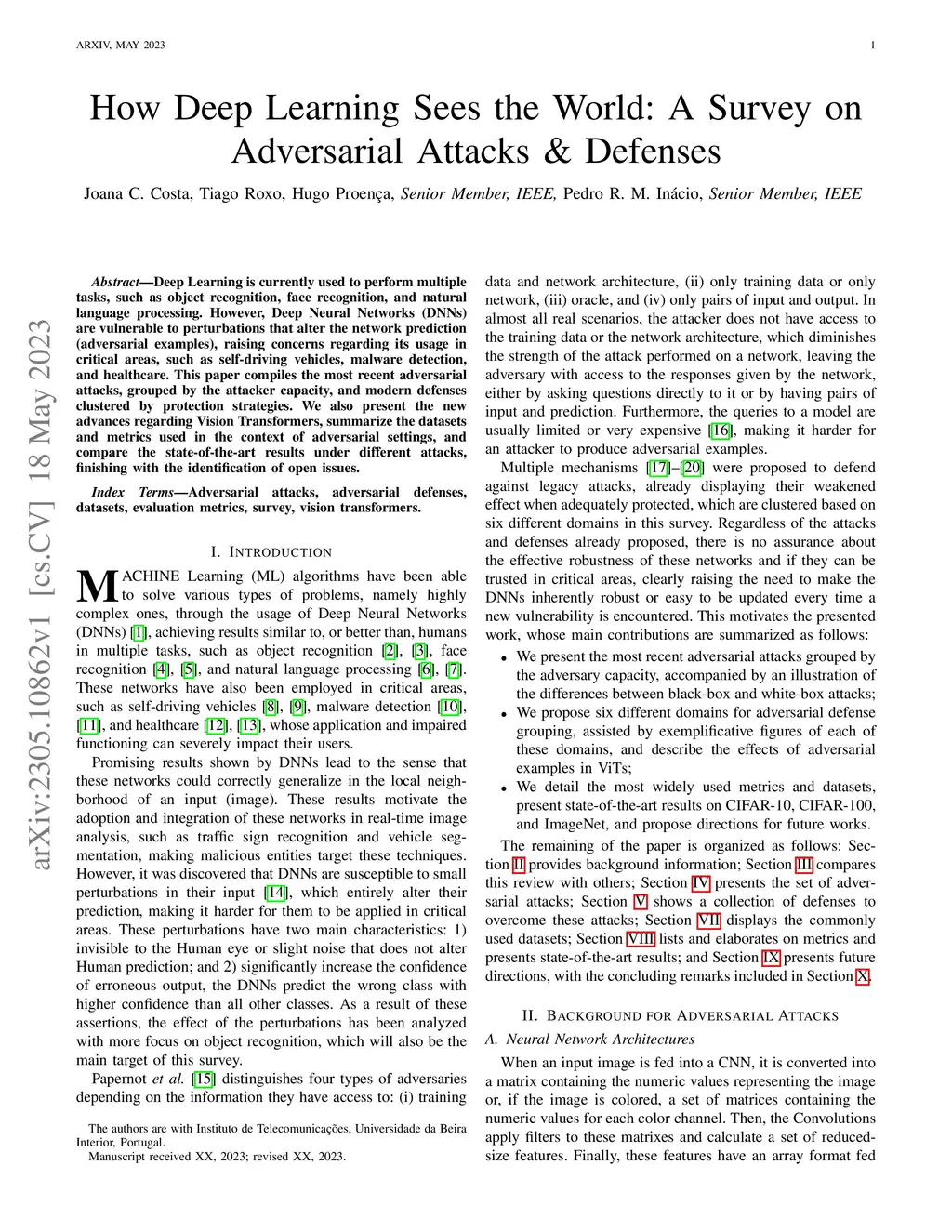 Deep Learning is currently used to perform multiple tasks, such as object recognition, face recognition, and natural language processing. However, Deep Neural Networks (DNNs) are vulnerable to perturbations that alter the network prediction (adversarial examples), raising concerns regarding its usage in critical areas, such as self-driving vehicles, malware detection, and healthcare. This paper compiles the most recent adversarial attacks, grouped by the attacker capacity, and modern defenses clustered by protection strategies. We also present the new advances regarding Vision Transformers, summarize the datasets and metrics used in the context of adversarial settings, and compare the state-of-the-art results under different attacks, finishing with the identification of open issues.