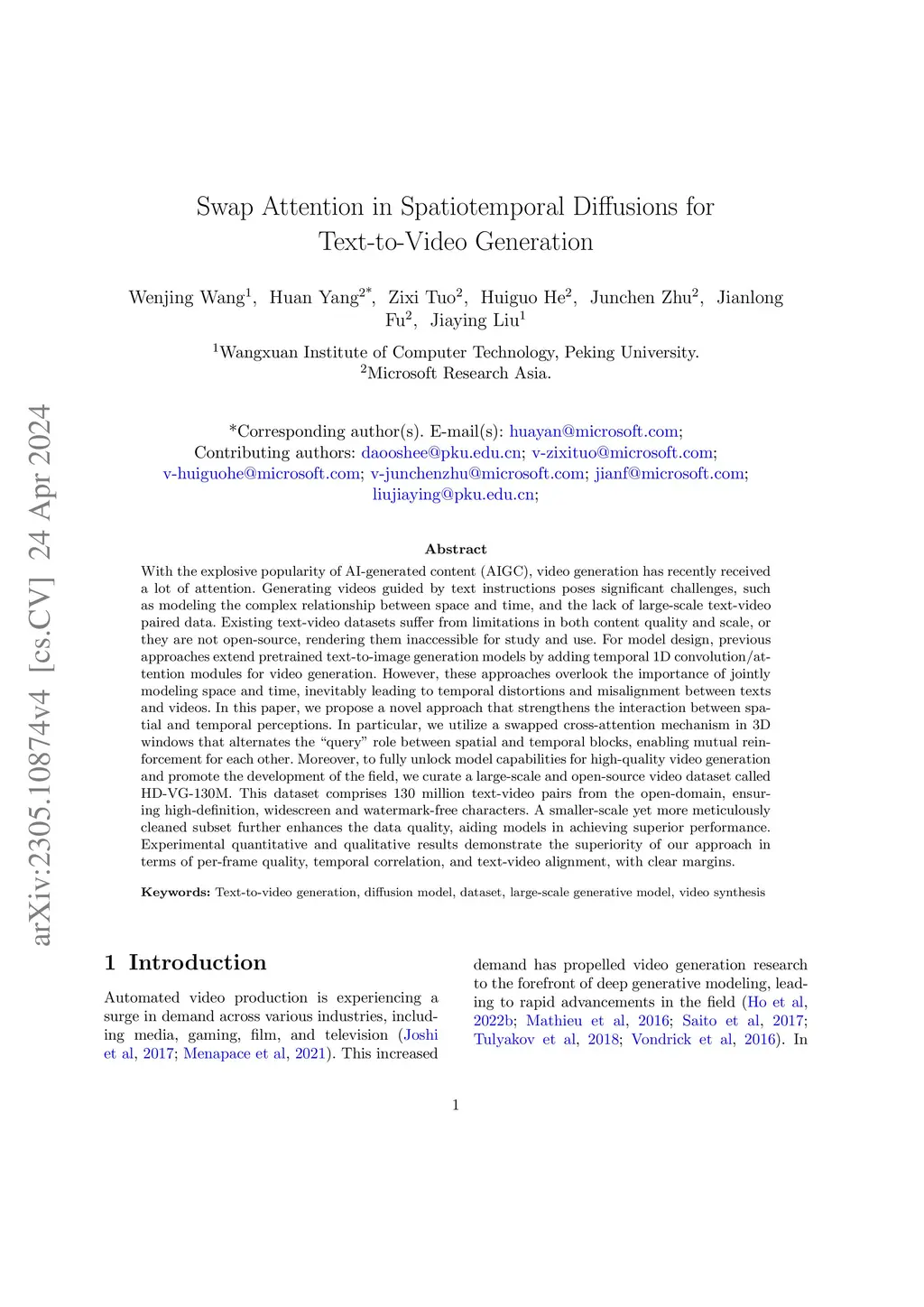 With the explosive popularity of AI-generated content (AIGC), video generation has recently received a lot of attention. Generating videos guided by text instructions poses significant challenges, such as modeling the complex relationship between space and time, and the lack of large-scale text-video paired data. Existing text-video datasets suffer from limitations in both content quality and scale, or they are not open-source, rendering them inaccessible for study and use. For model design, previous approaches extend pretrained text-to-image generation models by adding temporal 1D convolution/attention modules for video generation. However, these approaches overlook the importance of jointly modeling space and time, inevitably leading to temporal distortions and misalignment between texts and videos. In this paper, we propose a novel approach that strengthens the interaction between spatial and temporal perceptions. In particular, we utilize a swapped cross-attention mechanism in 3D windows that alternates the "query" role between spatial and temporal blocks, enabling mutual reinforcement for each other. Moreover, to fully unlock model capabilities for high-quality video generation and promote the development of the field, we curate a large-scale and open-source video dataset called HD-VG-130M. This dataset comprises 130 million text-video pairs from the open-domain, ensuring high-definition, widescreen and watermark-free characters. A smaller-scale yet more meticulously cleaned subset further enhances the data quality, aiding models in achieving superior performance. Experimental quantitative and qualitative results demonstrate the superiority of our approach in terms of per-frame quality, temporal correlation, and text-video alignment, with clear margins.