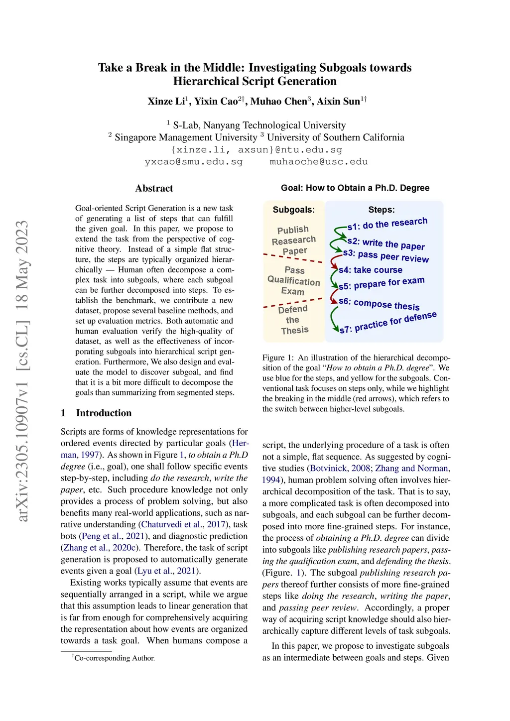 Goal-oriented Script Generation is a new task of generating a list of steps that can fulfill the given goal. In this paper, we propose to extend the task from the perspective of cognitive theory. Instead of a simple flat structure, the steps are typically organized hierarchically - Human often decompose a complex task into subgoals, where each subgoal can be further decomposed into steps. To establish the benchmark, we contribute a new dataset, propose several baseline methods, and set up evaluation metrics. Both automatic and human evaluation verify the high-quality of dataset, as well as the effectiveness of incorporating subgoals into hierarchical script generation. Furthermore, We also design and evaluate the model to discover subgoal, and find that it is a bit more difficult to decompose the goals than summarizing from segmented steps.