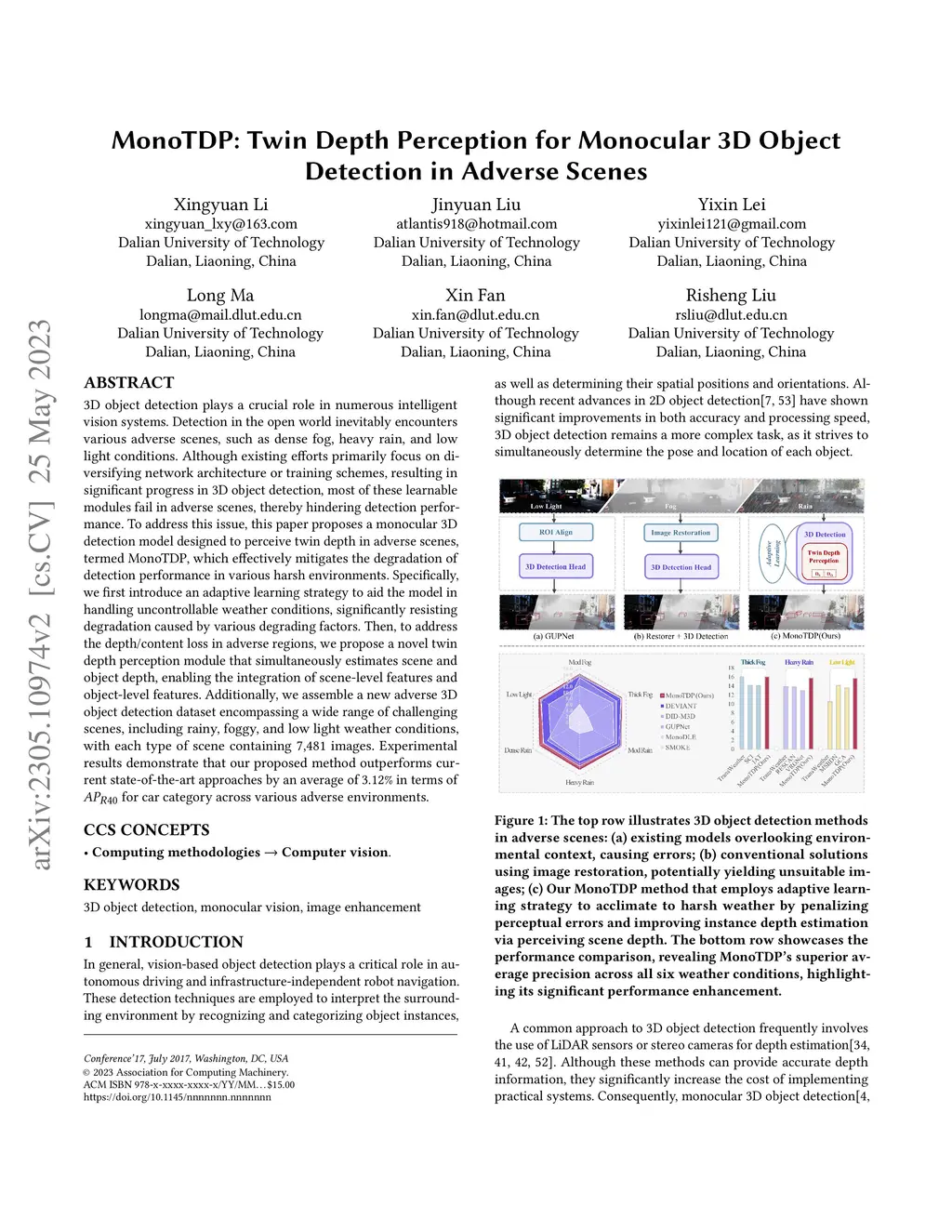 3D object detection plays a crucial role in numerous intelligent vision systems. Detection in the open world inevitably encounters various adverse scenes, such as dense fog, heavy rain, and low light conditions. Although existing efforts primarily focus on diversifying network architecture or training schemes, resulting in significant progress in 3D object detection, most of these learnable modules fail in adverse scenes, thereby hindering detection performance. To address this issue, this paper proposes a monocular 3D detection model designed to perceive twin depth in adverse scenes, termed MonoTDP, which effectively mitigates the degradation of detection performance in various harsh environments. Specifically, we first introduce an adaptive learning strategy to aid the model in handling uncontrollable weather conditions, significantly resisting degradation caused by various degrading factors. Then, to address the depth/content loss in adverse regions, we propose a novel twin depth perception module that simultaneously estimates scene and object depth, enabling the integration of scene-level features and object-level features. Additionally, we assemble a new adverse 3D object detection dataset encompassing a wide range of challenging scenes, including rainy, foggy, and low light weather conditions, with each type of scene containing 7,481 images. Experimental results demonstrate that our proposed method outperforms current state-of-the-art approaches by an average of 3.12% in terms of AP_R40 for car category across various adverse environments.