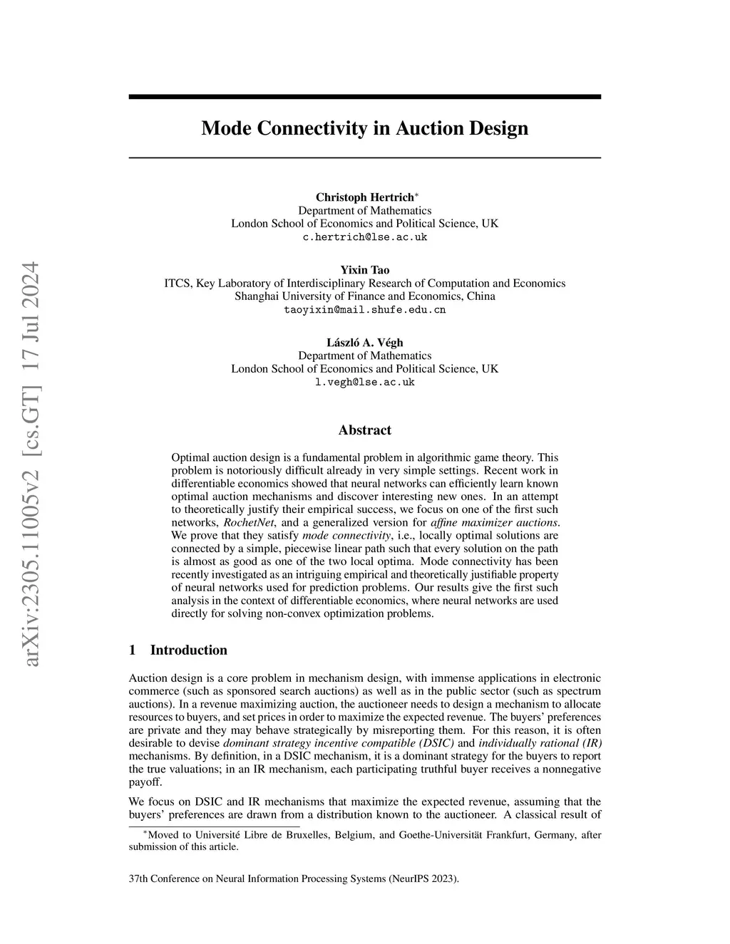 Optimal auction design is a fundamental problem in algorithmic game theory. This problem is notoriously difficult already in very simple settings. Recent work in differentiable economics showed that neural networks can efficiently learn known optimal auction mechanisms and discover interesting new ones. In an attempt to theoretically justify their empirical success, we focus on one of the first such networks, RochetNet, and a generalized version for affine maximizer auctions. We prove that they satisfy mode connectivity, i.e., locally optimal solutions are connected by a simple, piecewise linear path such that every solution on the path is almost as good as one of the two local optima. Mode connectivity has been recently investigated as an intriguing empirical and theoretically justifiable property of neural networks used for prediction problems. Our results give the first such analysis in the context of differentiable economics, where neural networks are used directly for solving non-convex optimization problems.