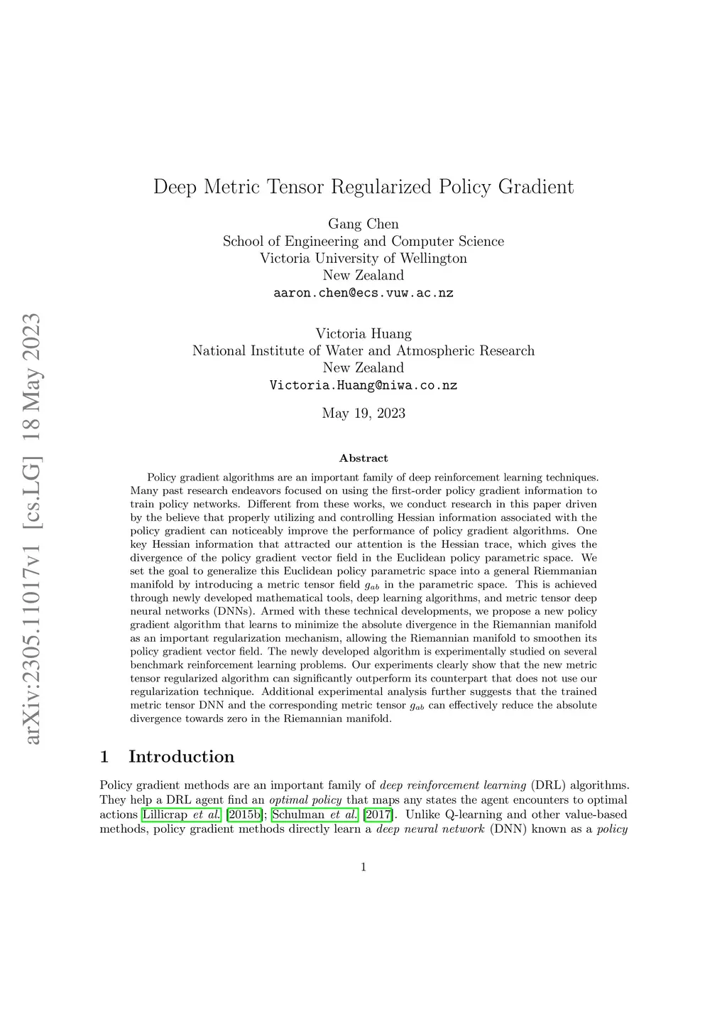 Policy gradient algorithms are an important family of deep reinforcement learning techniques. Many past research endeavors focused on using the first-order policy gradient information to train policy networks. Different from these works, we conduct research in this paper driven by the believe that properly utilizing and controlling Hessian information associated with the policy gradient can noticeably improve the performance of policy gradient algorithms. One key Hessian information that attracted our attention is the Hessian trace, which gives the divergence of the policy gradient vector field in the Euclidean policy parametric space. We set the goal to generalize this Euclidean policy parametric space into a general Riemmanian manifold by introducing a metric tensor field in the parametric space. This is achieved through newly developed mathematical tools, deep learning algorithms, and metric tensor deep neural networks (DNNs). Armed with these technical developments, we propose a new policy gradient algorithm that learns to minimize the absolute divergence in the Riemannian manifold as an important regularization mechanism, allowing the Riemannian manifold to smoothen its policy gradient vector field. The newly developed algorithm is experimentally studied on several benchmark reinforcement learning problems. Our experiments clearly show that the new metric tensor regularized algorithm can significantly outperform its counterpart that does not use our regularization technique. Additional experimental analysis further suggests that the trained metric tensor DNN and the corresponding metric tensor can effectively reduce the absolute divergence towards zero in the Riemannian manifold.