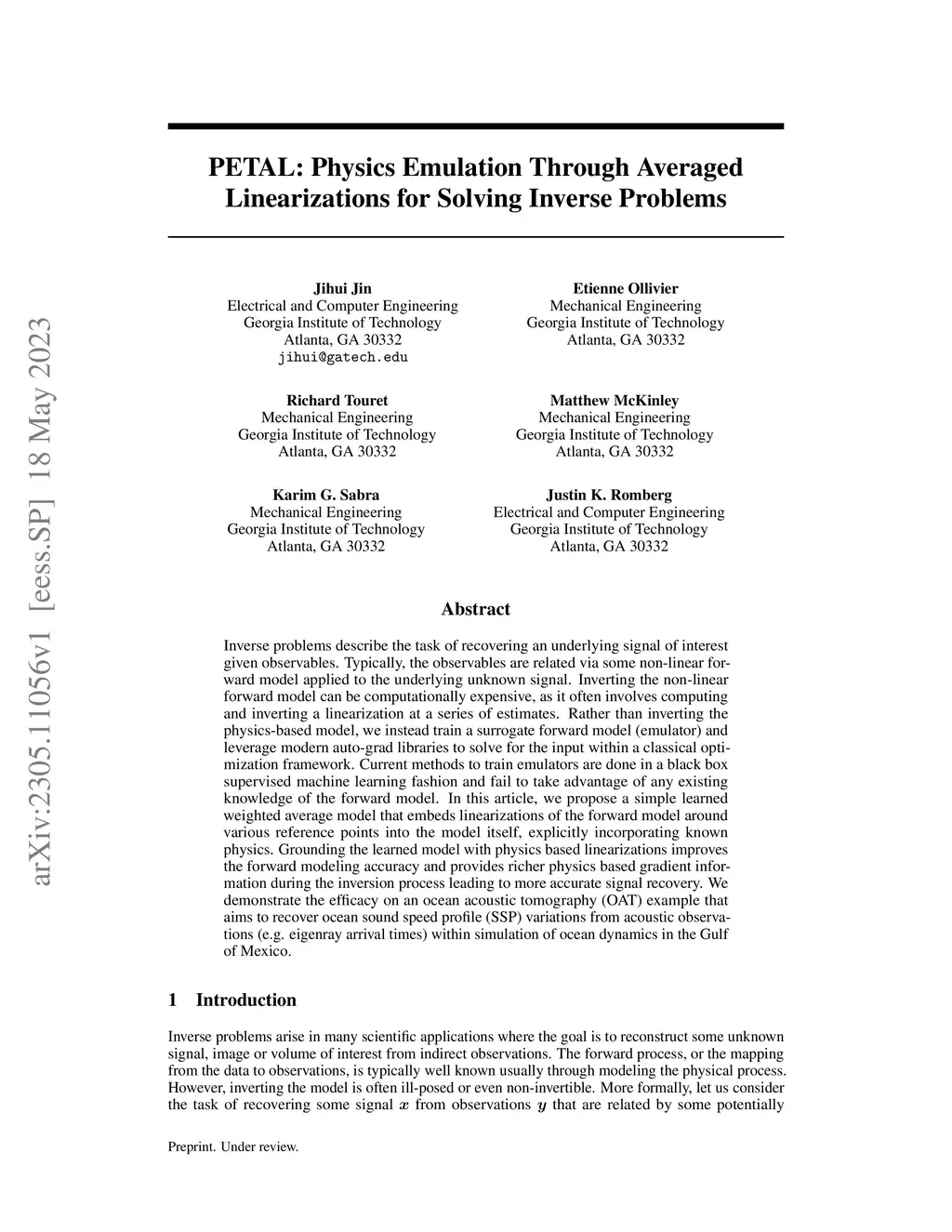 Inverse problems describe the task of recovering an underlying signal of interest given observables. Typically, the observables are related via some non-linear forward model applied to the underlying unknown signal. Inverting the non-linear forward model can be computationally expensive, as it often involves computing and inverting a linearization at a series of estimates. Rather than inverting the physics-based model, we instead train a surrogate forward model (emulator) and leverage modern auto-grad libraries to solve for the input within a classical optimization framework. Current methods to train emulators are done in a black box supervised machine learning fashion and fail to take advantage of any existing knowledge of the forward model. In this article, we propose a simple learned weighted average model that embeds linearizations of the forward model around various reference points into the model itself, explicitly incorporating known physics. Grounding the learned model with physics based linearizations improves the forward modeling accuracy and provides richer physics based gradient information during the inversion process leading to more accurate signal recovery. We demonstrate the efficacy on an ocean acoustic tomography (OAT) example that aims to recover ocean sound speed profile (SSP) variations from acoustic observations (e.g. eigenray arrival times) within simulation of ocean dynamics in the Gulf of Mexico.