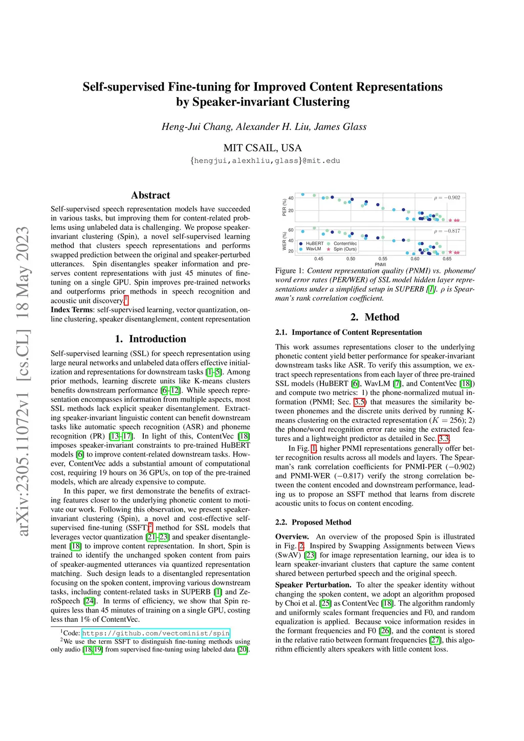 Self-supervised speech representation models have succeeded in various tasks, but improving them for content-related problems using unlabeled data is challenging. We propose speaker-invariant clustering (Spin), a novel self-supervised learning method that clusters speech representations and performs swapped prediction between the original and speaker-perturbed utterances. Spin disentangles speaker information and preserves content representations with just 45 minutes of fine-tuning on a single GPU. Spin improves pre-trained networks and outperforms prior methods in speech recognition and acoustic unit discovery.