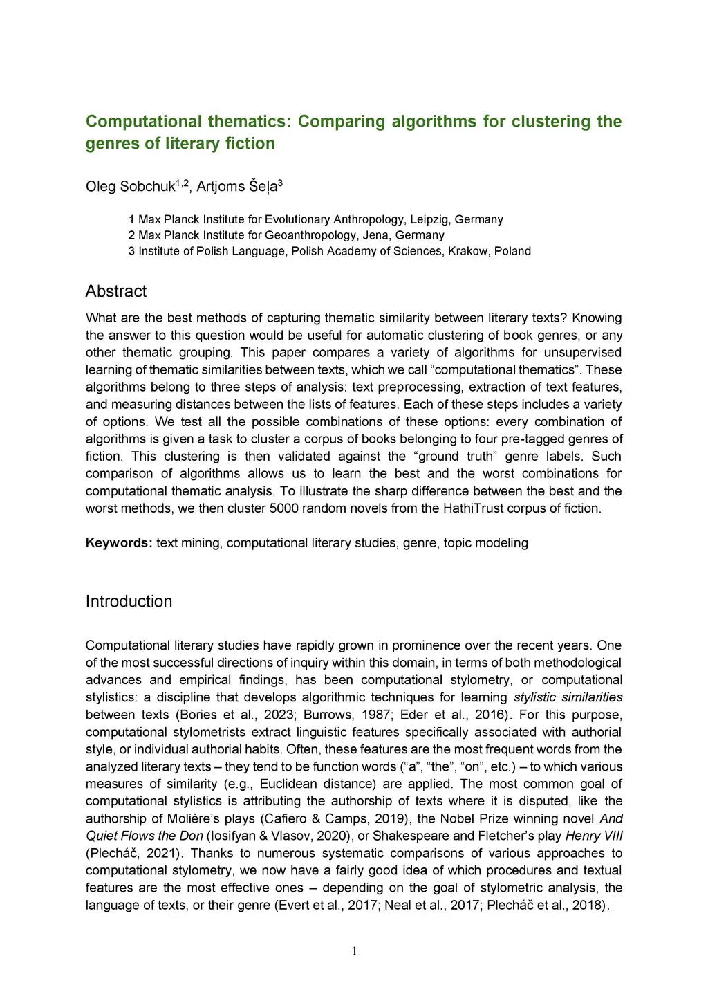 What are the best methods of capturing thematic similarity between literary texts? Knowing the answer to this question would be useful for automatic clustering of book genres, or any other thematic grouping. This paper compares a variety of algorithms for unsupervised learning of thematic similarities between texts, which we call "computational thematics". These algorithms belong to three steps of analysis: text preprocessing, extraction of text features, and measuring distances between the lists of features. Each of these steps includes a variety of options. We test all the possible combinations of these options: every combination of algorithms is given a task to cluster a corpus of books belonging to four pre-tagged genres of fiction. This clustering is then validated against the "ground truth" genre labels. Such comparison of algorithms allows us to learn the best and the worst combinations for computational thematic analysis. To illustrate the sharp difference between the best and the worst methods, we then cluster 5000 random novels from the HathiTrust corpus of fiction.
