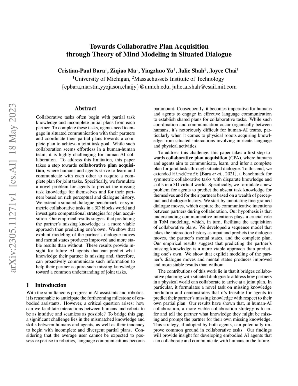 Towards Collaborative Plan Acquisition through Theory of Mind Modeling