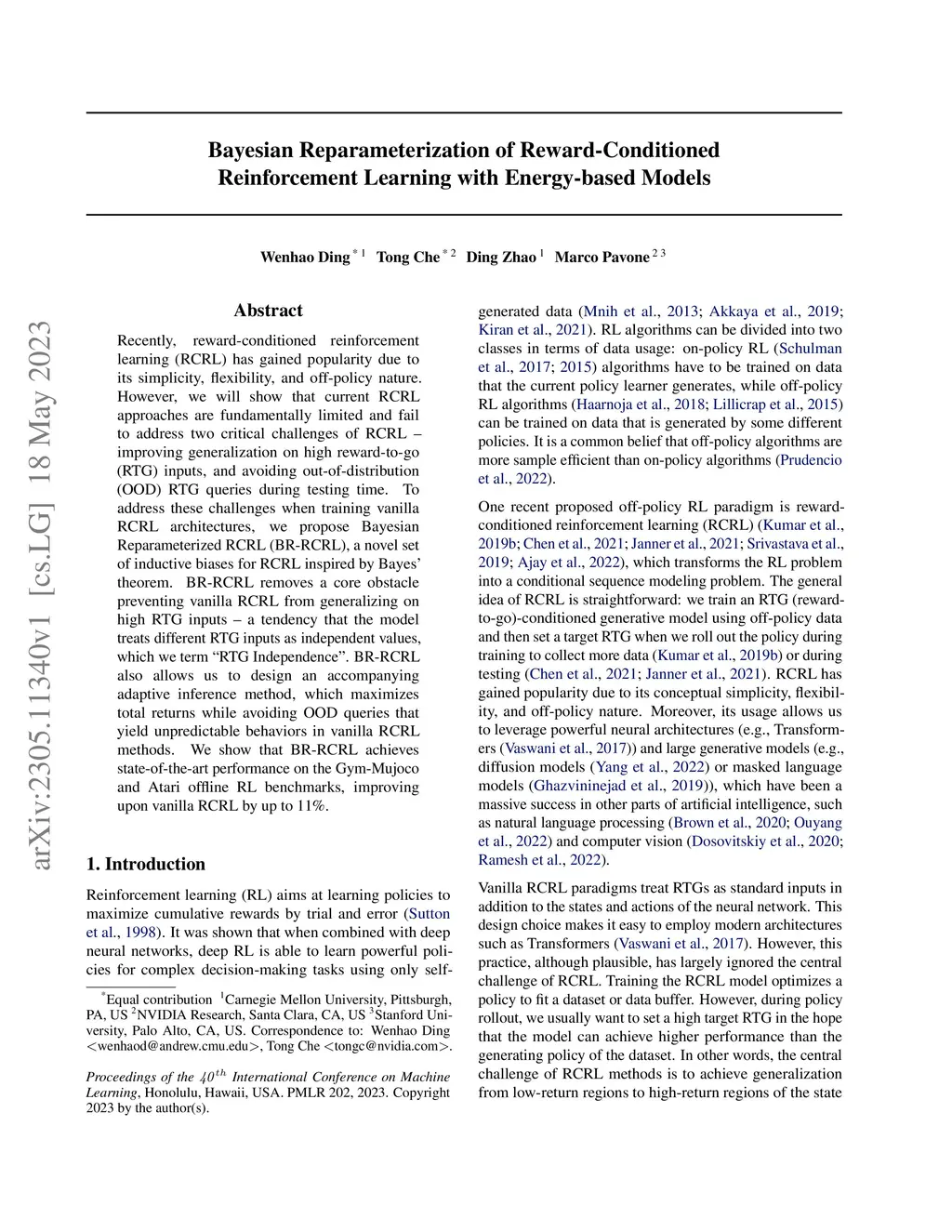 Bayesian Reparameterization of Reward-Conditioned Reinforcement Learning