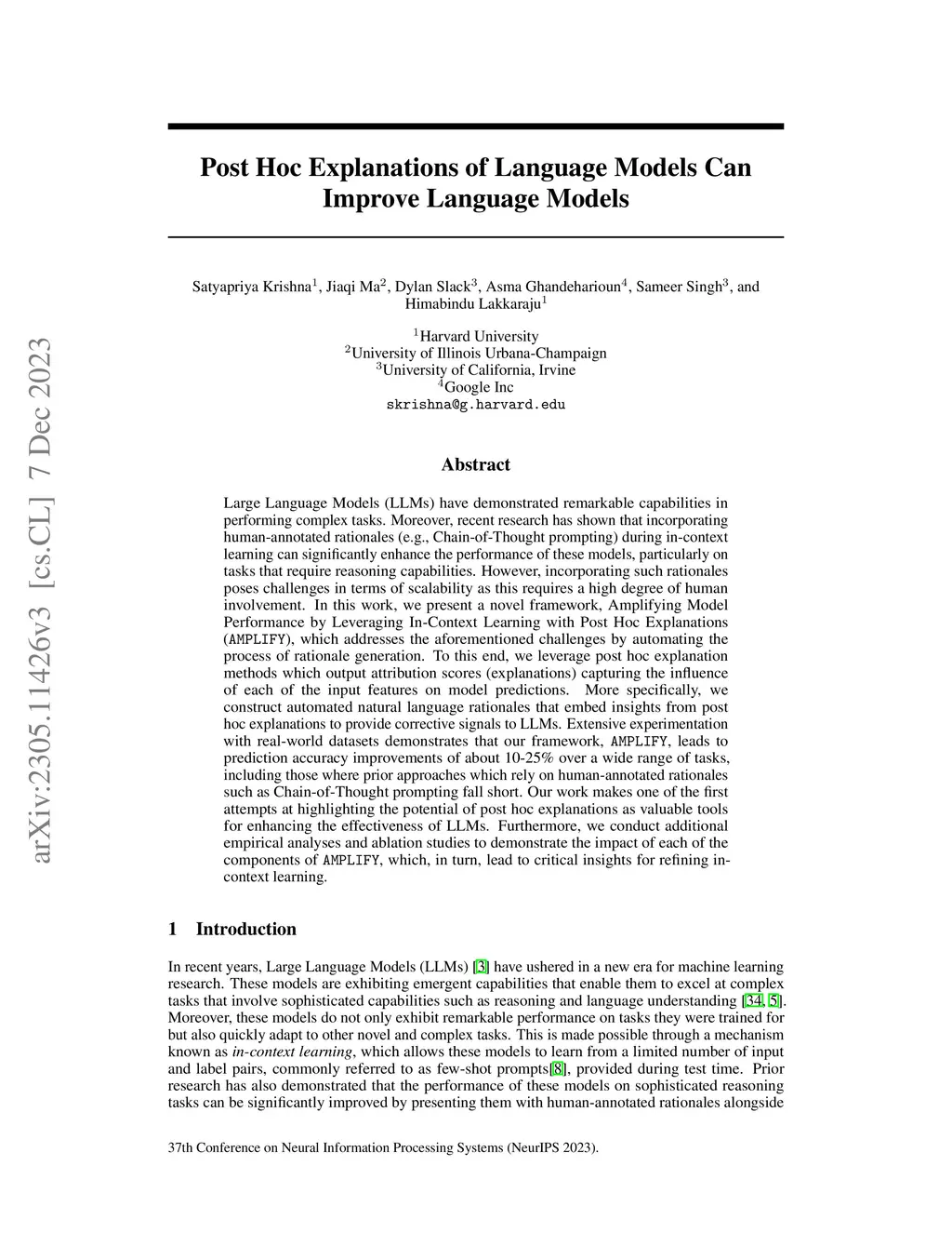 Large Language Models (LLMs) have demonstrated remarkable capabilities in performing complex tasks. Moreover, recent research has shown that incorporating human-annotated rationales (e.g., Chain-of-Thought prompting) during in-context learning can significantly enhance the performance of these models, particularly on tasks that require reasoning capabilities. However, incorporating such rationales poses challenges in terms of scalability as this requires a high degree of human involvement. In this work, we present a novel framework, Amplifying Model Performance by Leveraging In-Context Learning with Post Hoc Explanations (AMPLIFY), which addresses the aforementioned challenges by automating the process of rationale generation. To this end, we leverage post hoc explanation methods which output attribution scores (explanations) capturing the influence of each of the input features on model predictions. More specifically, we construct automated natural language rationales that embed insights from post hoc explanations to provide corrective signals to LLMs. Extensive experimentation with real-world datasets demonstrates that our framework, AMPLIFY, leads to prediction accuracy improvements of about 10-25% over a wide range of tasks, including those where prior approaches which rely on human-annotated rationales such as Chain-of-Thought prompting fall short. Our work makes one of the first attempts at highlighting the potential of post hoc explanations as valuable tools for enhancing the effectiveness of LLMs. Furthermore, we conduct additional empirical analyses and ablation studies to demonstrate the impact of each of the components of AMPLIFY, which, in turn, leads to critical insights for refining in-context learning.