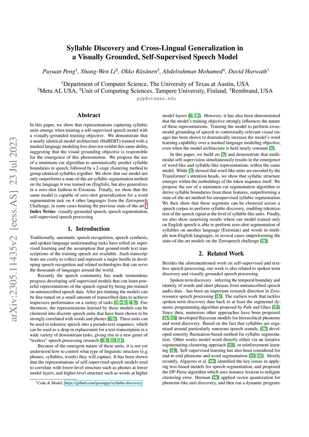 In this paper, we show that representations capturing syllabic units emerge when training a self-supervised speech model with a visually-grounded training objective. We demonstrate that a nearly identical model architecture (HuBERT) trained with a masked language modeling loss does not exhibit this same ability, suggesting that the visual grounding objective is responsible for the emergence of this phenomenon. We propose the use of a minimum cut algorithm to automatically predict syllable boundaries in speech, followed by a 2-stage clustering method to group identical syllables together. We show that our model not only outperforms a state-of-the-art syllabic segmentation method on the language it was trained on (English), but also generalizes in a zero-shot fashion to Estonian. Finally, we show that the same model is capable of zero-shot generalization for a word segmentation task on 4 other languages from the Zerospeech Challenge, in some cases beating the previous state-of-the-art.