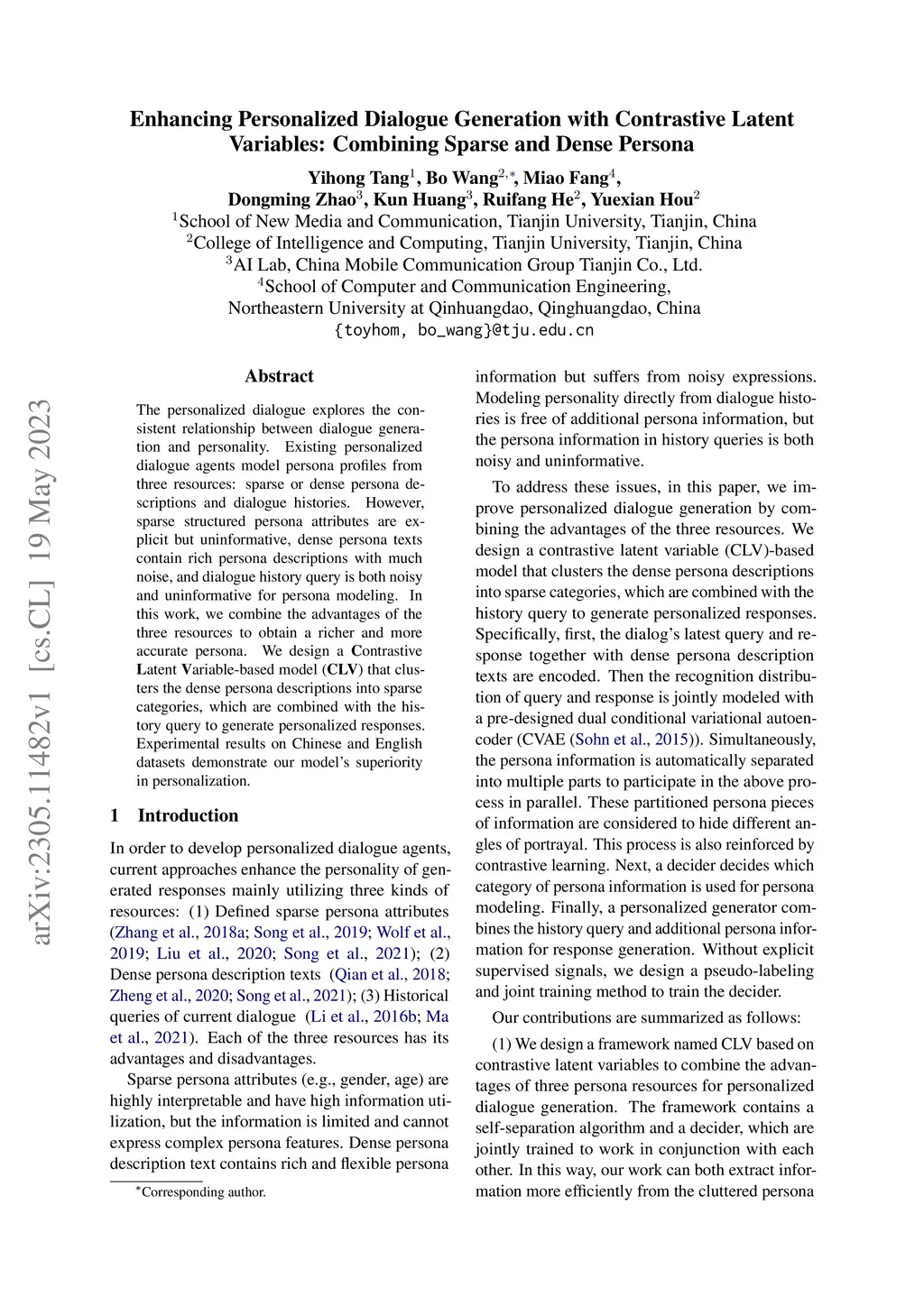 The personalized dialogue explores the consistent relationship between dialogue generation and personality. Existing personalized dialogue agents model persona profiles from three resources: sparse or dense persona descriptions and dialogue histories. However, sparse structured persona attributes are explicit but uninformative, dense persona texts contain rich persona descriptions with much noise, and dialogue history query is both noisy and uninformative for persona modeling. In this work, we combine the advantages of the three resources to obtain a richer and more accurate persona. We design a Contrastive Latent Variable-based model (CLV) that clusters the dense persona descriptions into sparse categories, which are combined with the history query to generate personalized responses. Experimental results on Chinese and English datasets demonstrate our model's superiority in personalization.