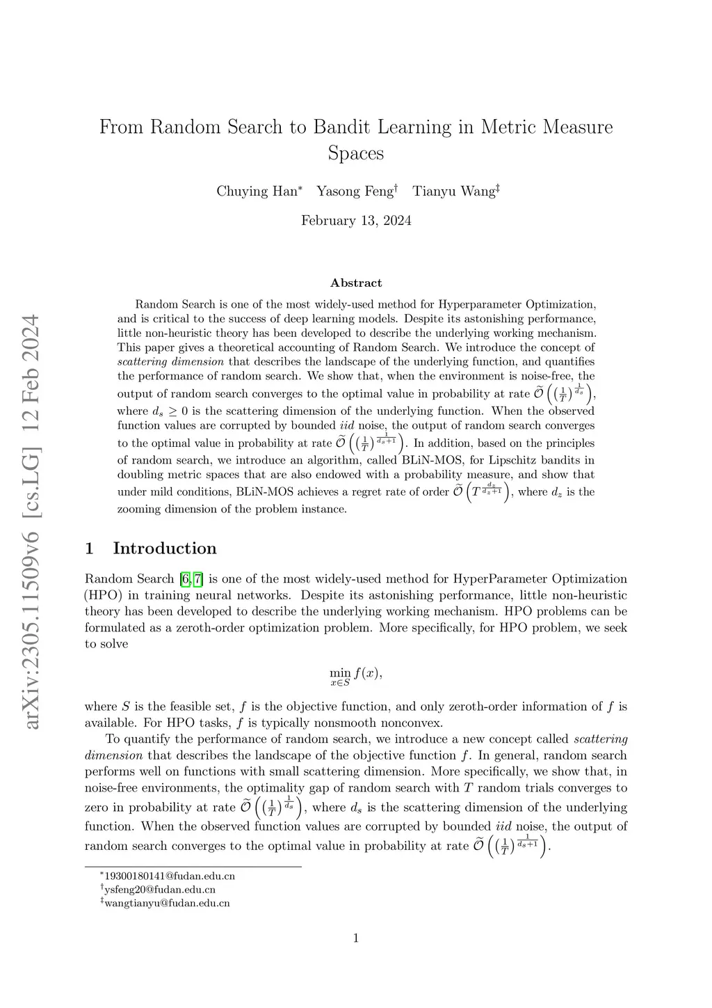 Random Search is one of the most widely-used method for Hyperparameter Optimization, and is critical to the success of deep learning models. Despite its astonishing performance, little non-heuristic theory has been developed to describe the underlying working mechanism. This paper gives a theoretical accounting of Random Search. We introduce the concept of \emph{scattering dimension} that describes the landscape of the underlying function, and quantifies the performance of random search. We show that, when the environment is noise-free, the output of random search converges to the optimal value in probability at rate $ \widetilde{\mathcal{O}} \left( \left( \frac{1}{T} \right)^{ \frac{1}{d_s} } \right) $, where $ d_s \ge 0 $ is the scattering dimension of the underlying function. When the observed function values are corrupted by bounded noise, the output of random search converges to the optimal value in probability at rate $ \widetilde{\mathcal{O}} \left( \left( \frac{1}{T} \right)^{ \frac{1}{d_s + 1} } \right) $. In addition, based on the principles of random search, we introduce an algorithm, called BLiN-MOS, for Lipschitz bandits in doubling metric spaces that are also endowed with a probability measure, and show that under mild conditions, BLiN-MOS achieves a regret rate of order $ \widetilde{\mathcal{O}} \left( T^{ \frac{d_z}{d_z + 1} } \right) $, where is the zooming dimension of the problem instance.