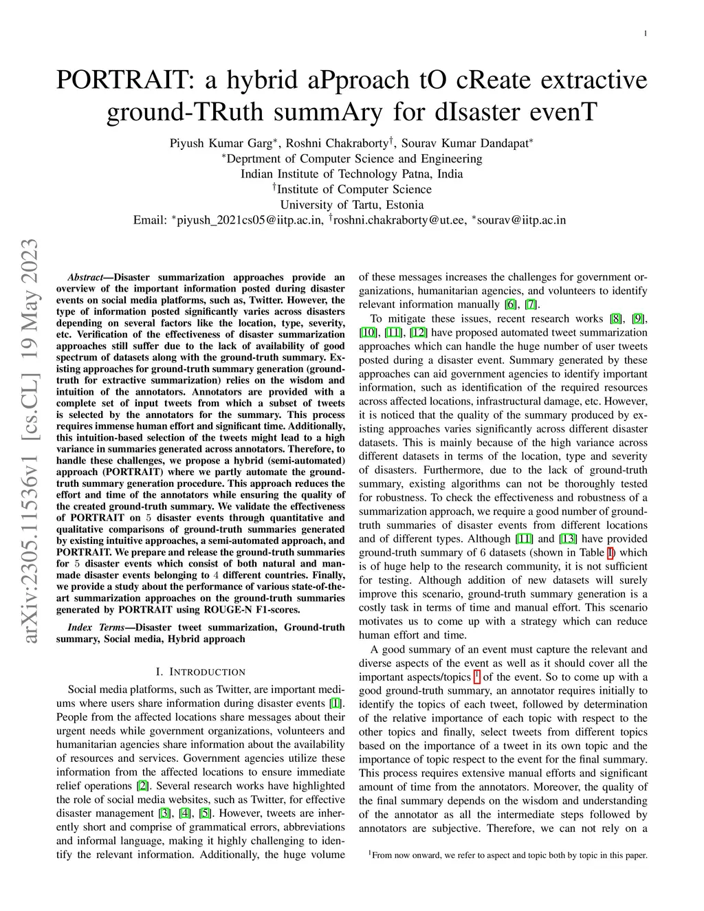 Disaster summarization approaches provide an overview of the important information posted during disaster events on social media platforms, such as, Twitter. However, the type of information posted significantly varies across disasters depending on several factors like the location, type, severity, etc. Verification of the effectiveness of disaster summarization approaches still suffer due to the lack of availability of good spectrum of datasets along with the ground-truth summary. Existing approaches for ground-truth summary generation (ground-truth for extractive summarization) relies on the wisdom and intuition of the annotators. Annotators are provided with a complete set of input tweets from which a subset of tweets is selected by the annotators for the summary. This process requires immense human effort and significant time. Additionally, this intuition-based selection of the tweets might lead to a high variance in summaries generated across annotators. Therefore, to handle these challenges, we propose a hybrid (semi-automated) approach (PORTRAIT) where we partly automate the ground-truth summary generation procedure. This approach reduces the effort and time of the annotators while ensuring the quality of the created ground-truth summary. We validate the effectiveness of PORTRAIT on 5 disaster events through quantitative and qualitative comparisons of ground-truth summaries generated by existing intuitive approaches, a semi-automated approach, and PORTRAIT. We prepare and release the ground-truth summaries for 5 disaster events which consist of both natural and man-made disaster events belonging to 4 different countries. Finally, we provide a study about the performance of various state-of-the-art summarization approaches on the ground-truth summaries generated by PORTRAIT using ROUGE-N F1-scores.