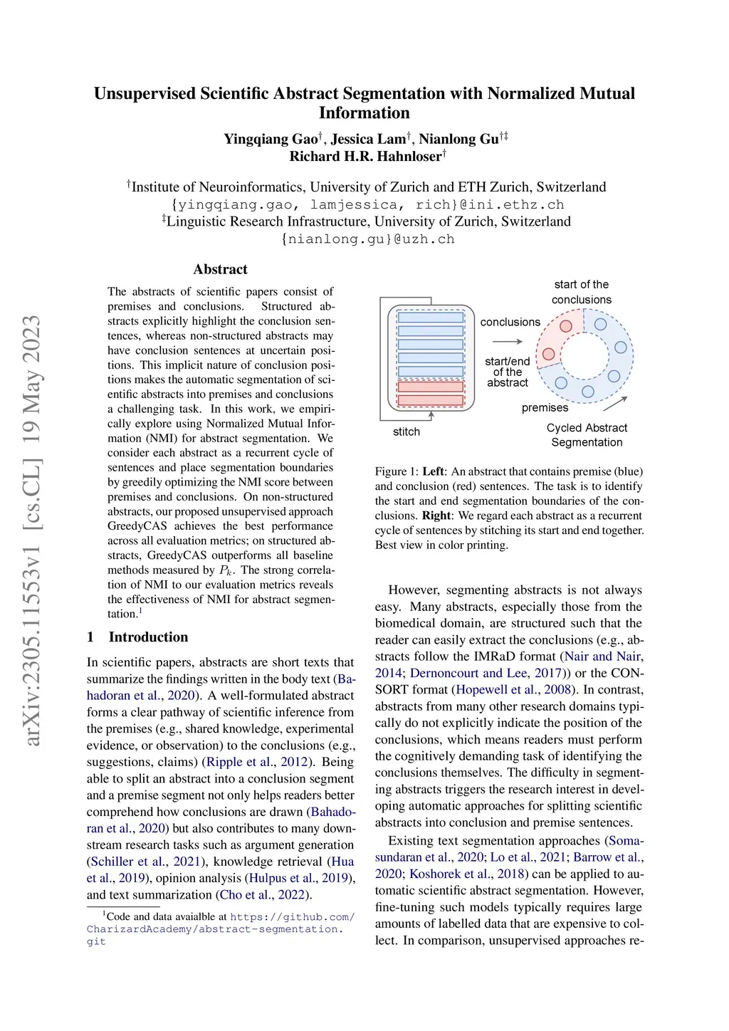 The abstracts of scientific papers consist of premises and conclusions. Structured abstracts explicitly highlight the conclusion sentences, whereas non-structured abstracts may have conclusion sentences at uncertain positions. This implicit nature of conclusion positions makes the automatic segmentation of scientific abstracts into premises and conclusions a challenging task. In this work, we empirically explore using Normalized Mutual Information (NMI) for abstract segmentation. We consider each abstract as a recurrent cycle of sentences and place segmentation boundaries by greedily optimizing the NMI score between premises and conclusions. On non-structured abstracts, our proposed unsupervised approach GreedyCAS achieves the best performance across all evaluation metrics; on structured abstracts, GreedyCAS outperforms all baseline methods measured by . The strong correlation of NMI to our evaluation metrics reveals the effectiveness of NMI for abstract segmentation.