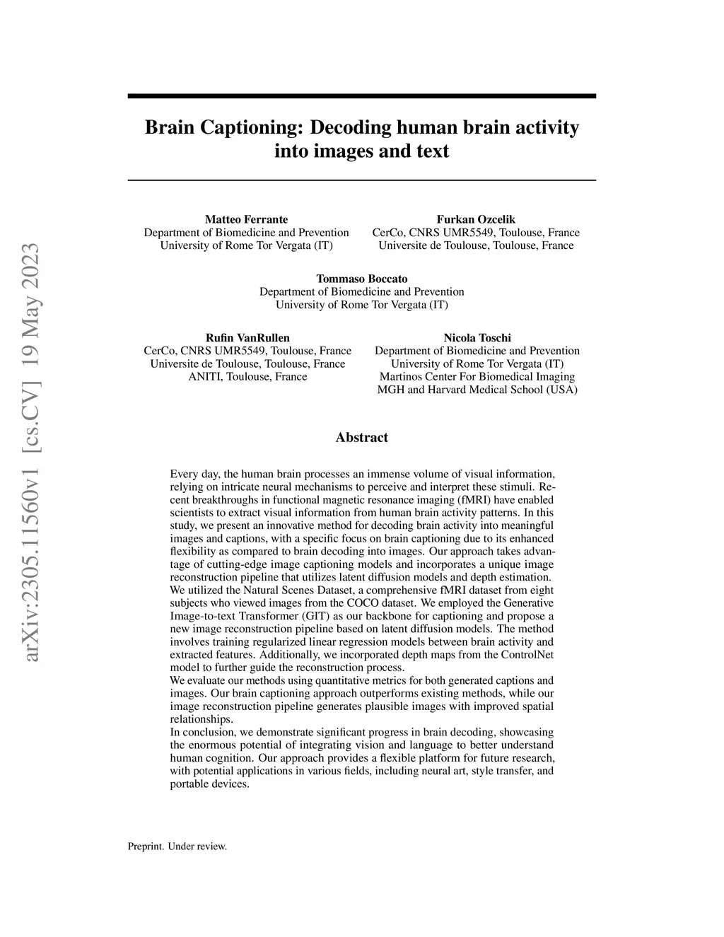 Every day, the human brain processes an immense volume of visual information, relying on intricate neural mechanisms to perceive and interpret these stimuli. Recent breakthroughs in functional magnetic resonance imaging (fMRI) have enabled scientists to extract visual information from human brain activity patterns. In this study, we present an innovative method for decoding brain activity into meaningful images and captions, with a specific focus on brain captioning due to its enhanced flexibility as compared to brain decoding into images. Our approach takes advantage of cutting-edge image captioning models and incorporates a unique image reconstruction pipeline that utilizes latent diffusion models and depth estimation. We utilized the Natural Scenes Dataset, a comprehensive fMRI dataset from eight subjects who viewed images from the COCO dataset. We employed the Generative Image-to-text Transformer (GIT) as our backbone for captioning and propose a new image reconstruction pipeline based on latent diffusion models. The method involves training regularized linear regression models between brain activity and extracted features. Additionally, we incorporated depth maps from the ControlNet model to further guide the reconstruction process. We evaluate our methods using quantitative metrics for both generated captions and images. Our brain captioning approach outperforms existing methods, while our image reconstruction pipeline generates plausible images with improved spatial relationships. In conclusion, we demonstrate significant progress in brain decoding, showcasing the enormous potential of integrating vision and language to better understand human cognition. Our approach provides a flexible platform for future research, with potential applications in various fields, including neural art, style transfer, and portable devices.