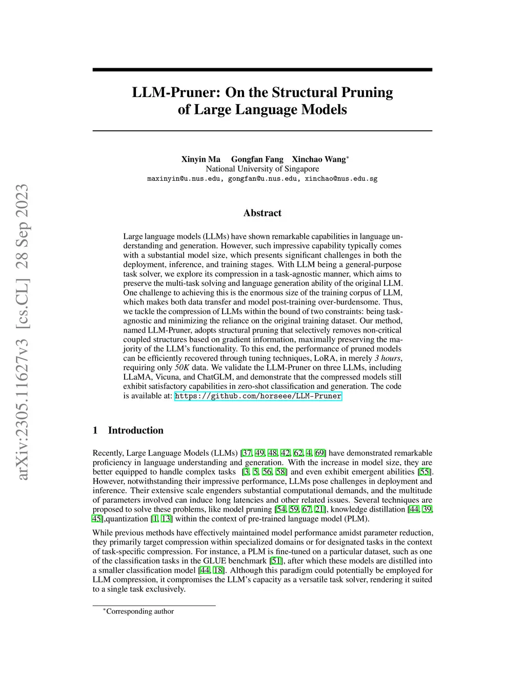 LLM-Pruner: On the Structural Pruning of Large Language Models