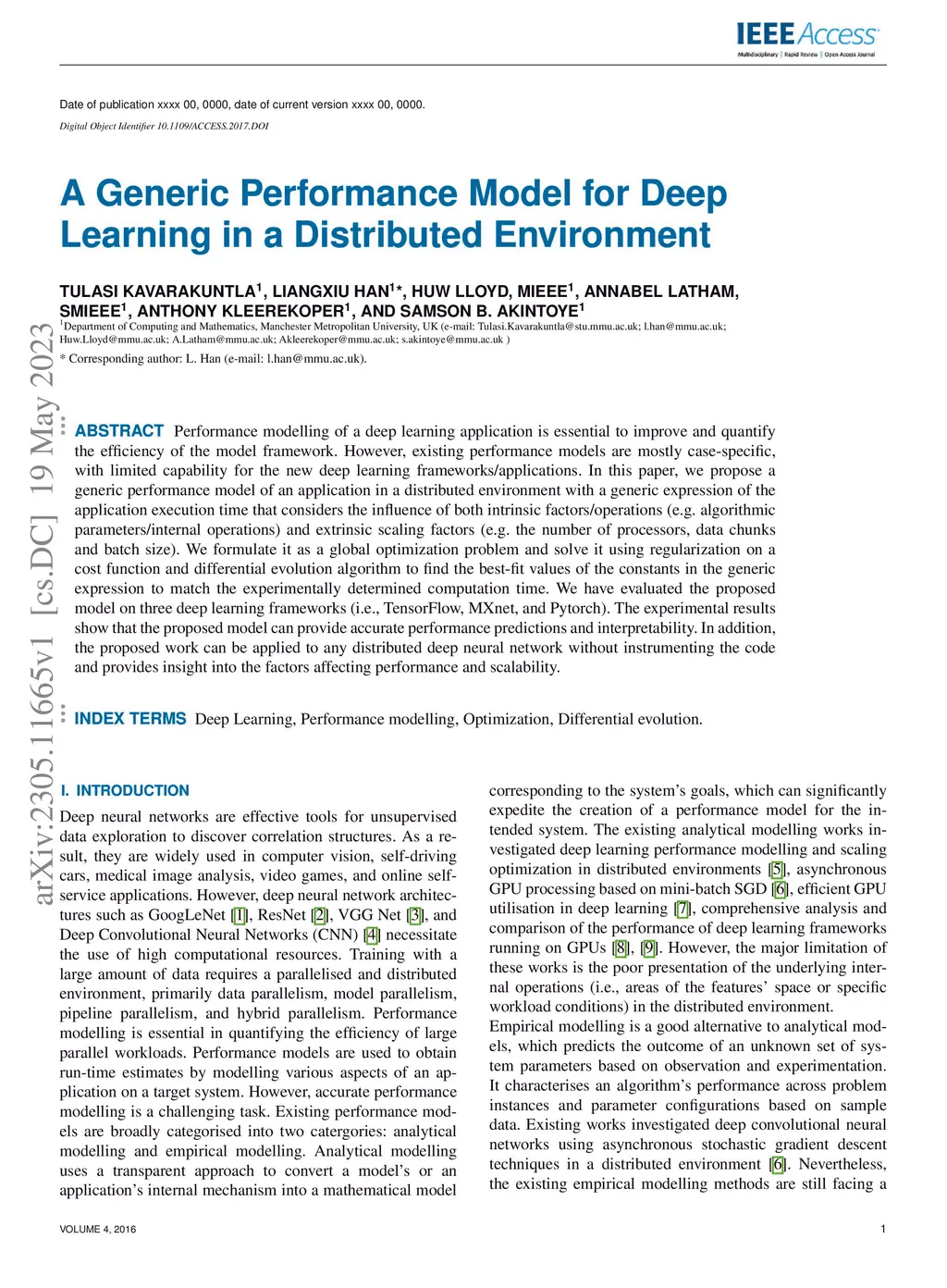Performance modelling of a deep learning application is essential to improve and quantify the efficiency of the model framework. However, existing performance models are mostly case-specific, with limited capability for the new deep learning frameworks/applications. In this paper, we propose a generic performance model of an application in a distributed environment with a generic expression of the application execution time that considers the influence of both intrinsic factors/operations (e.g. algorithmic parameters/internal operations) and extrinsic scaling factors (e.g. the number of processors, data chunks and batch size). We formulate it as a global optimization problem and solve it using regularization on a cost function and differential evolution algorithm to find the best-fit values of the constants in the generic expression to match the experimentally determined computation time. We have evaluated the proposed model on three deep learning frameworks (i.e., TensorFlow, MXnet, and Pytorch). The experimental results show that the proposed model can provide accurate performance predictions and interpretability. In addition, the proposed work can be applied to any distributed deep neural network without instrumenting the code and provides insight into the factors affecting performance and scalability.