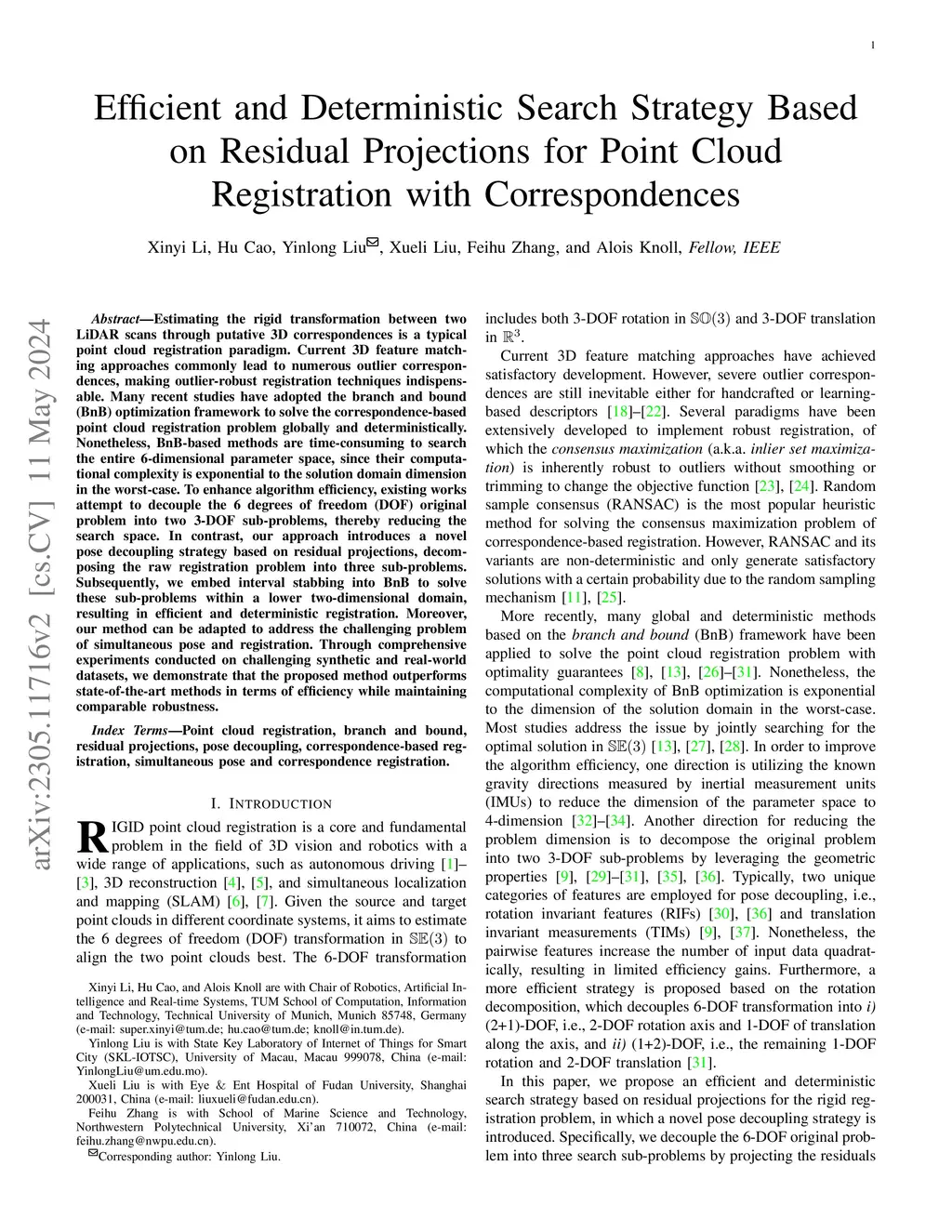 Estimating the rigid transformation between two LiDAR scans through putative 3D correspondences is a typical point cloud registration paradigm. Current 3D feature matching approaches commonly lead to numerous outlier correspondences, making outlier-robust registration techniques indispensable. Many recent studies have adopted the branch and bound (BnB) optimization framework to solve the correspondence-based point cloud registration problem globally and deterministically. Nonetheless, BnB-based methods are time-consuming to search the entire 6-dimensional parameter space, since their computational complexity is exponential to the solution domain dimension in the worst-case. To enhance algorithm efficiency, existing works attempt to decouple the 6 degrees of freedom (DOF) original problem into two 3-DOF sub-problems, thereby reducing the search space. In contrast, our approach introduces a novel pose decoupling strategy based on residual projections, decomposing the raw registration problem into three sub-problems. Subsequently, we embed interval stabbing into BnB to solve these sub-problems within a lower two-dimensional domain, resulting in efficient and deterministic registration. Moreover, our method can be adapted to address the challenging problem of simultaneous pose and registration. Through comprehensive experiments conducted on challenging synthetic and real-world datasets, we demonstrate that the proposed method outperforms state-of-the-art methods in terms of efficiency while maintaining comparable robustness.