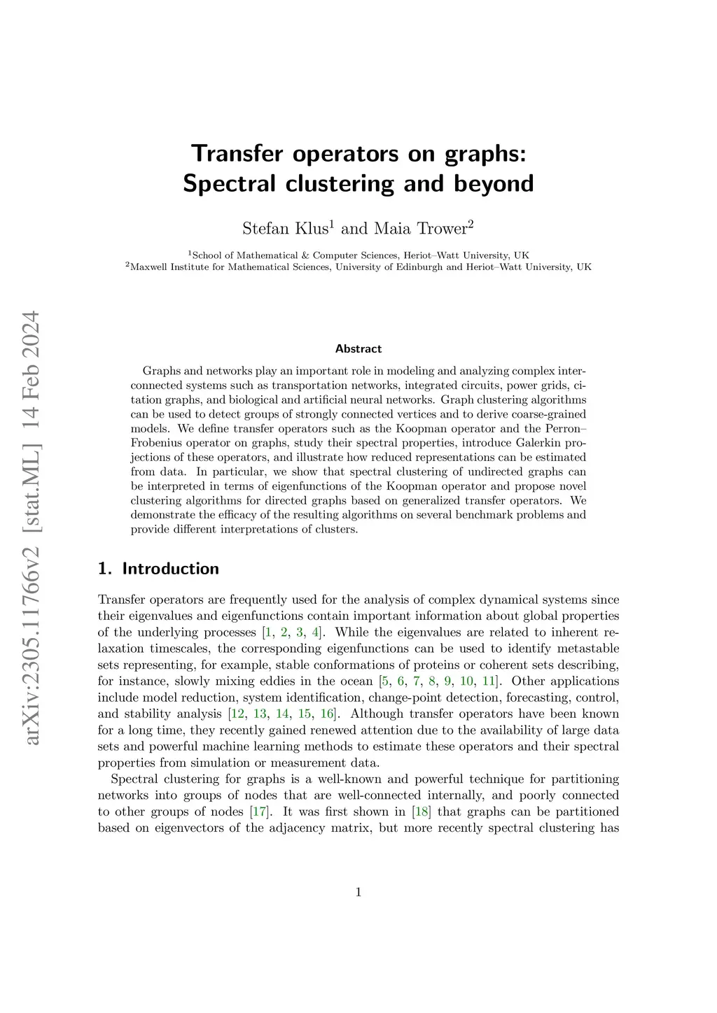 Graphs and networks play an important role in modeling and analyzing complex interconnected systems such as transportation networks, integrated circuits, power grids, citation graphs, and biological and artificial neural networks. Graph clustering algorithms can be used to detect groups of strongly connected vertices and to derive coarse-grained models. We define transfer operators such as the Koopman operator and the Perron-Frobenius operator on graphs, study their spectral properties, introduce Galerkin projections of these operators, and illustrate how reduced representations can be estimated from data. In particular, we show that spectral clustering of undirected graphs can be interpreted in terms of eigenfunctions of the Koopman operator and propose novel clustering algorithms for directed graphs based on generalized transfer operators. We demonstrate the efficacy of the resulting algorithms on several benchmark problems and provide different interpretations of clusters.