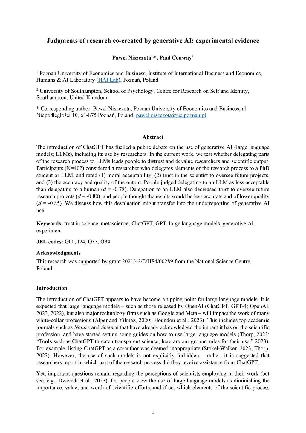 Judgments of research co-created by generative AI: experimental evidence