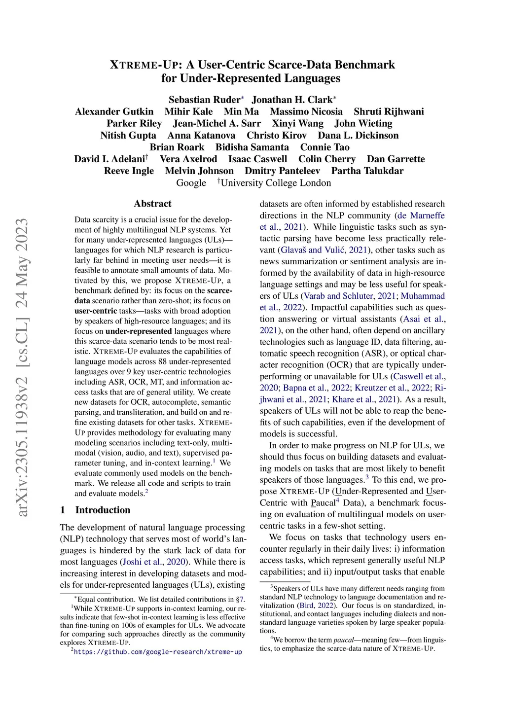 Data scarcity is a crucial issue for the development of highly multilingual NLP systems. Yet for many under-represented languages (ULs) -- languages for which NLP re-search is particularly far behind in meeting user needs -- it is feasible to annotate small amounts of data. Motivated by this, we propose XTREME-UP, a benchmark defined by: its focus on the scarce-data scenario rather than zero-shot; its focus on user-centric tasks -- tasks with broad adoption by speakers of high-resource languages; and its focus on under-represented languages where this scarce-data scenario tends to be most realistic. XTREME-UP evaluates the capabilities of language models across 88 under-represented languages over 9 key user-centric technologies including ASR, OCR, MT, and information access tasks that are of general utility. We create new datasets for OCR, autocomplete, semantic parsing, and transliteration, and build on and refine existing datasets for other tasks. XTREME-UP provides methodology for evaluating many modeling scenarios including text-only, multi-modal (vision, audio, and text),supervised parameter tuning, and in-context learning. We evaluate commonly used models on the benchmark. We release all code and scripts to train and evaluate models
