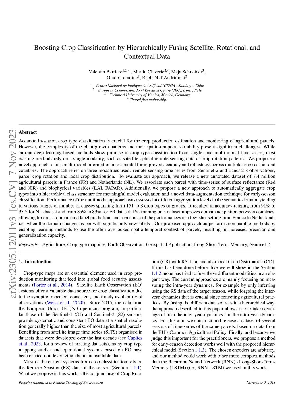Accurate in-season crop type classification is crucial for the crop production estimation and monitoring of agricultural parcels. However, the complexity of the plant growth patterns and their spatio-temporal variability present significant challenges. While current deep learning-based methods show promise in crop type classification from single- and multi-modal time series, most existing methods rely on a single modality, such as satellite optical remote sensing data or crop rotation patterns. We propose a novel approach to fuse multimodal information into a model for improved accuracy and robustness across multiple years and countries. The approach relies on three modalities used: remote sensing time series from Sentinel-2 and Landsat 8 observations, parcel crop rotation and local crop distribution. To evaluate our approach, we release a new annotated dataset of 7.4 million agricultural parcels in France and Netherlands. We associate each parcel with time-series of surface reflectance (Red and NIR) and biophysical variables (LAI, FAPAR). Additionally, we propose a new approach to automatically aggregate crop types into a hierarchical class structure for meaningful model evaluation and a novel data-augmentation technique for early-season classification. Performance of the multimodal approach was assessed at different aggregation level in the semantic domain spanning from 151 to 8 crop types or groups. It resulted in accuracy ranging from 91\% to 95\% for NL dataset and from 85\% to 89\% for FR dataset. Pre-training on a dataset improves domain adaptation between countries, allowing for cross-domain zero-shot learning, and robustness of the performances in a few-shot setting from France to Netherlands. Our proposed approach outperforms comparable methods by enabling learning methods to use the often overlooked spatio-temporal context of parcels, resulting in increased preci...