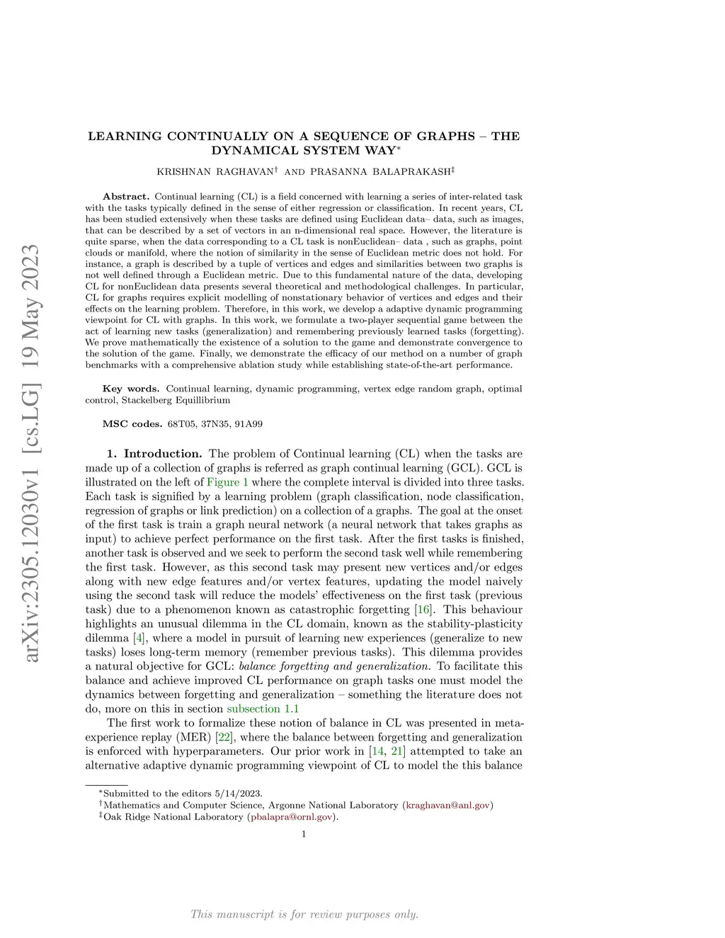 Continual learning~(CL) is a field concerned with learning a series of inter-related task with the tasks typically defined in the sense of either regression or classification. In recent years, CL has been studied extensively when these tasks are defined using Euclidean data -- data, such as images, that can be described by a set of vectors in an n-dimensional real space. However, the literature is quite sparse, when the data corresponding to a CL task is nonEuclidean -- data , such as graphs, point clouds or manifold, where the notion of similarity in the sense of Euclidean metric does not hold. For instance, a graph is described by a tuple of vertices and edges and similarities between two graphs is not well defined through a Euclidean metric. Due to this fundamental nature of the data, developing CL for nonEuclidean data presents several theoretical and methodological challenges. In particular, CL for graphs requires explicit modelling of nonstationary behavior of vertices and edges and their effects on the learning problem. Therefore, in this work, we develop a adaptive dynamic programming viewpoint for CL with graphs. In this work, we formulate a two-player sequential game between the act of learning new tasks~(generalization) and remembering previously learned tasks~(forgetting). We prove mathematically the existence of a solution to the game and demonstrate convergence to the solution of the game. Finally, we demonstrate the efficacy of our method on a number of graph benchmarks with a comprehensive ablation study while establishing state-of-the-art performance.