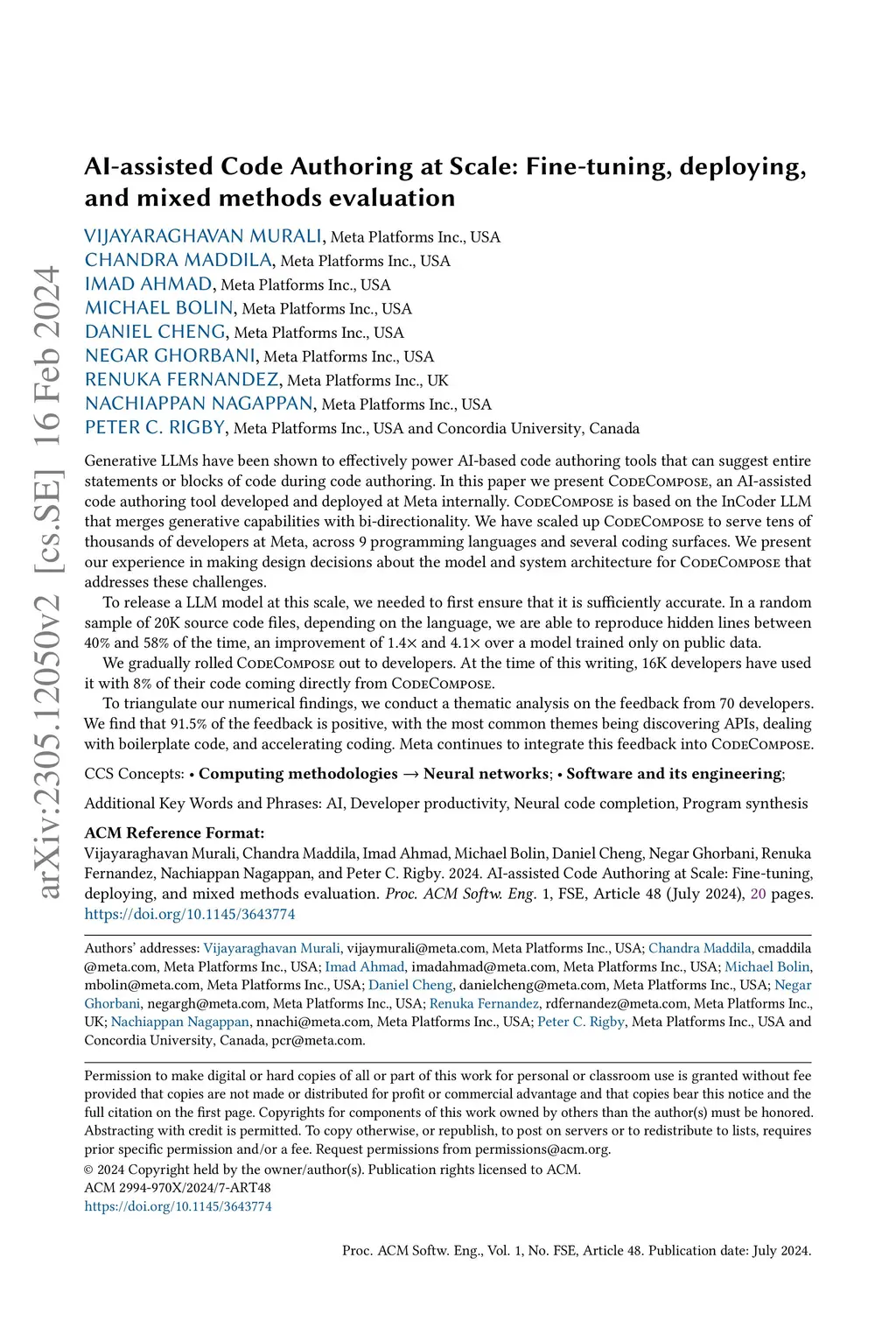 Generative LLMs have been shown to effectively power AI-based code authoring tools that can suggest entire statements or blocks of code during code authoring. In this paper we present CodeCompose, an AI-assisted code authoring tool developed and deployed at Meta internally. CodeCompose is based on the InCoder LLM that merges generative capabilities with bi-directionality. We have scaled up CodeCompose to serve tens of thousands of developers at Meta, across 9 programming languages and several coding surfaces. We present our experience in making design decisions about the model and system architecture for CodeCompose that addresses these challenges. To release a LLM model at this scale, we needed to first ensure that it is sufficiently accurate. In a random sample of 20K source code files, depending on the language, we are able to reproduce hidden lines between 40% and 58% of the time, an improvement of 1.4x and 4.1x over a model trained only on public data. We gradually rolled CodeCompose out to developers. At the time of this writing, 16K developers have used it with 8% of their code coming directly from CodeCompose. To triangulate our numerical findings, we conduct a thematic analysis on the feedback from 70 developers. We find that 91.5% of the feedback is positive, with the most common themes being discovering APIs, dealing with boilerplate code, and accelerating coding. Meta continues to integrate this feedback into CodeCompose.