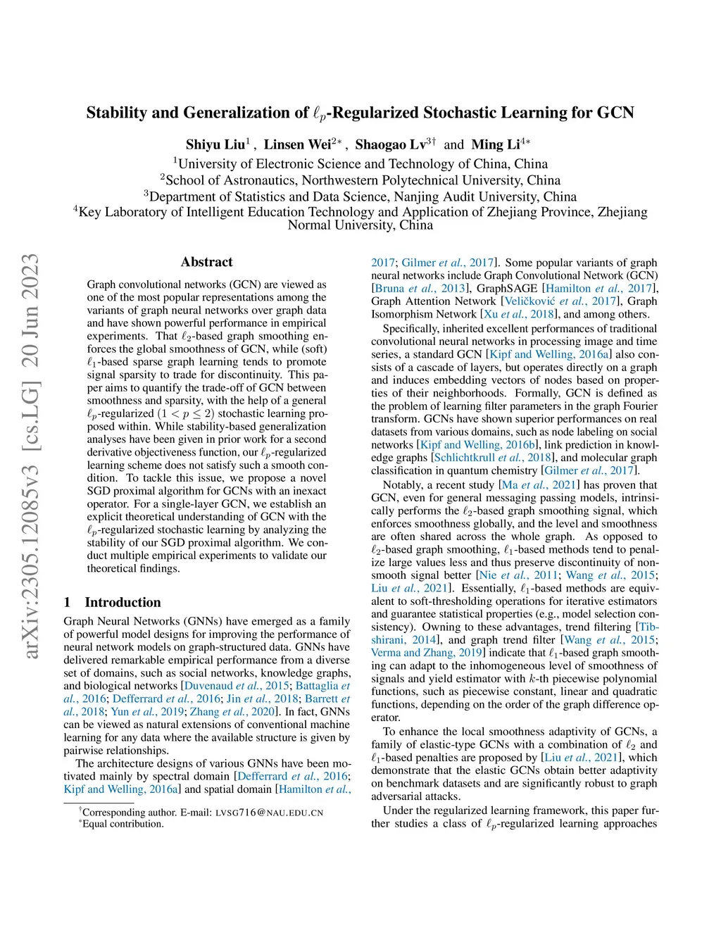 Graph convolutional networks (GCN) are viewed as one of the most popular representations among the variants of graph neural networks over graph data and have shown powerful performance in empirical experiments. That -based graph smoothing enforces the global smoothness of GCN, while (soft) -based sparse graph learning tends to promote signal sparsity to trade for discontinuity. This paper aims to quantify the trade-off of GCN between smoothness and sparsity, with the help of a general -regularized stochastic learning proposed within. While stability-based generalization analyses have been given in prior work for a second derivative objectiveness function, our -regularized learning scheme does not satisfy such a smooth condition. To tackle this issue, we propose a novel SGD proximal algorithm for GCNs with an inexact operator. For a single-layer GCN, we establish an explicit theoretical understanding of GCN with the -regularized stochastic learning by analyzing the stability of our SGD proximal algorithm. We conduct multiple empirical experiments to validate our theoretical findings.