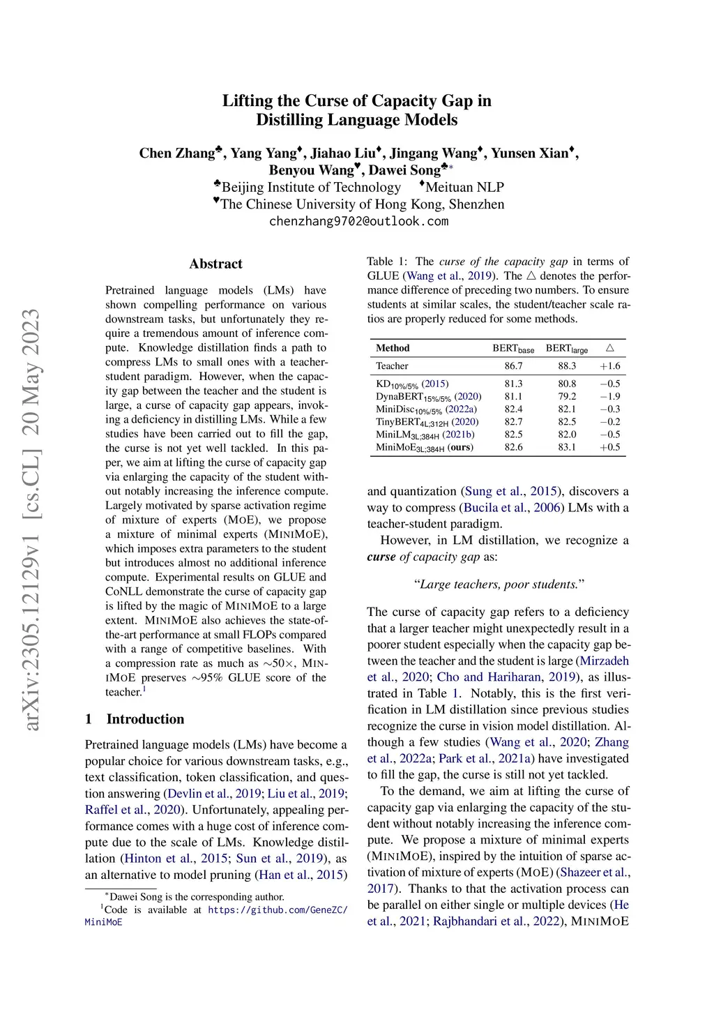 Pretrained language models (LMs) have shown compelling performance on various downstream tasks, but unfortunately they require a tremendous amount of inference compute. Knowledge distillation finds a path to compress LMs to small ones with a teacher-student paradigm. However, when the capacity gap between the teacher and the student is large, a curse of capacity gap appears, invoking a deficiency in distilling LMs. While a few studies have been carried out to fill the gap, the curse is not yet well tackled. In this paper, we aim at lifting the curse of capacity gap via enlarging the capacity of the student without notably increasing the inference compute. Largely motivated by sparse activation regime of mixture of experts (MoE), we propose a mixture of minimal experts (MiniMoE), which imposes extra parameters to the student but introduces almost no additional inference compute. Experimental results on GLUE and CoNLL demonstrate the curse of capacity gap is lifted by the magic of MiniMoE to a large extent. MiniMoE also achieves the state-of-the-art performance at small FLOPs compared with a range of competitive baselines. With a compression rate as much as 50, MiniMoE preserves 95\% GLUE score of the teacher.