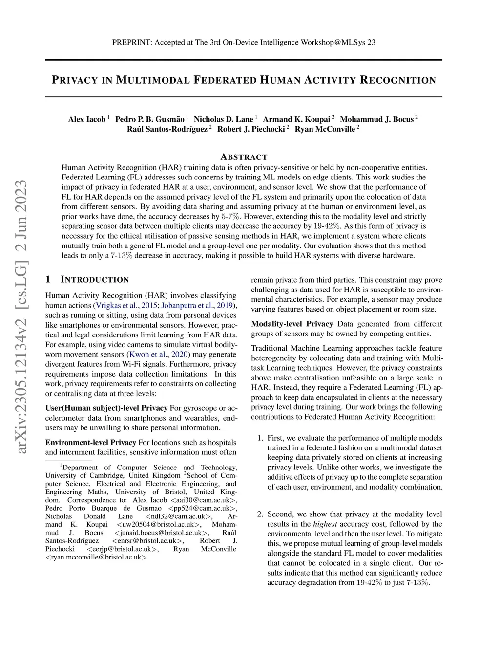 Human Activity Recognition (HAR) training data is often privacy-sensitive or held by non-cooperative entities. Federated Learning (FL) addresses such concerns by training ML models on edge clients. This work studies the impact of privacy in federated HAR at a user, environment, and sensor level. We show that the performance of FL for HAR depends on the assumed privacy level of the FL system and primarily upon the colocation of data from different sensors. By avoiding data sharing and assuming privacy at the human or environment level, as prior works have done, the accuracy decreases by 5-7%. However, extending this to the modality level and strictly separating sensor data between multiple clients may decrease the accuracy by 19-42%. As this form of privacy is necessary for the ethical utilisation of passive sensing methods in HAR, we implement a system where clients mutually train both a general FL model and a group-level one per modality. Our evaluation shows that this method leads to only a 7-13% decrease in accuracy, making it possible to build HAR systems with diverse hardware.