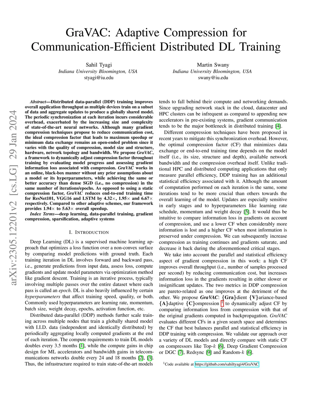 Distributed data-parallel (DDP) training improves overall application throughput as multiple devices train on a subset of data and aggregate updates to produce a globally shared model. The periodic synchronization at each iteration incurs considerable overhead, exacerbated by the increasing size and complexity of state-of-the-art neural networks. Although many gradient compression techniques propose to reduce communication cost, the ideal compression factor that leads to maximum speedup or minimum data exchange remains an open-ended problem since it varies with the quality of compression, model size and structure, hardware, network topology and bandwidth. We propose GraVAC, a framework to dynamically adjust compression factor throughout training by evaluating model progress and assessing gradient information loss associated with compression. GraVAC works in an online, black-box manner without any prior assumptions about a model or its hyperparameters, while achieving the same or better accuracy than dense SGD (i.e., no compression) in the same number of iterations/epochs. As opposed to using a static compression factor, GraVAC reduces end-to-end training time for ResNet101, VGG16 and LSTM by 4.32x, 1.95x and 6.67x respectively. Compared to other adaptive schemes, our framework provides 1.94x to 5.63x overall speedup.