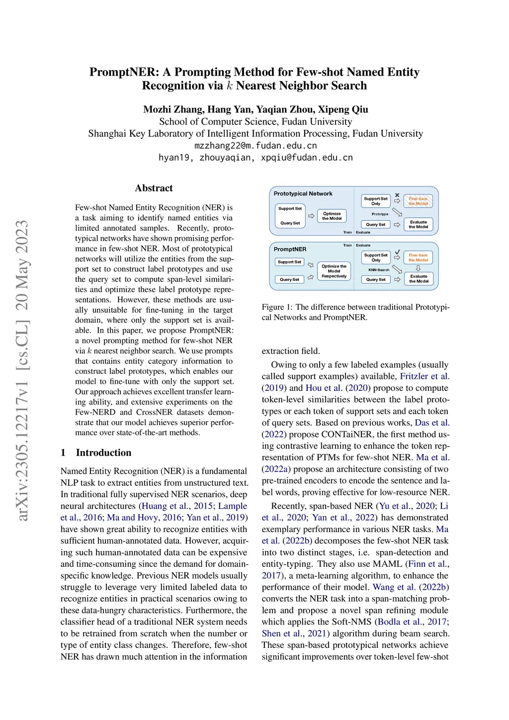 Few-shot Named Entity Recognition (NER) is a task aiming to identify named entities via limited annotated samples. Recently, prototypical networks have shown promising performance in few-shot NER. Most of prototypical networks will utilize the entities from the support set to construct label prototypes and use the query set to compute span-level similarities and optimize these label prototype representations. However, these methods are usually unsuitable for fine-tuning in the target domain, where only the support set is available. In this paper, we propose PromptNER: a novel prompting method for few-shot NER via k nearest neighbor search. We use prompts that contains entity category information to construct label prototypes, which enables our model to fine-tune with only the support set. Our approach achieves excellent transfer learning ability, and extensive experiments on the Few-NERD and CrossNER datasets demonstrate that our model achieves superior performance over state-of-the-art methods.