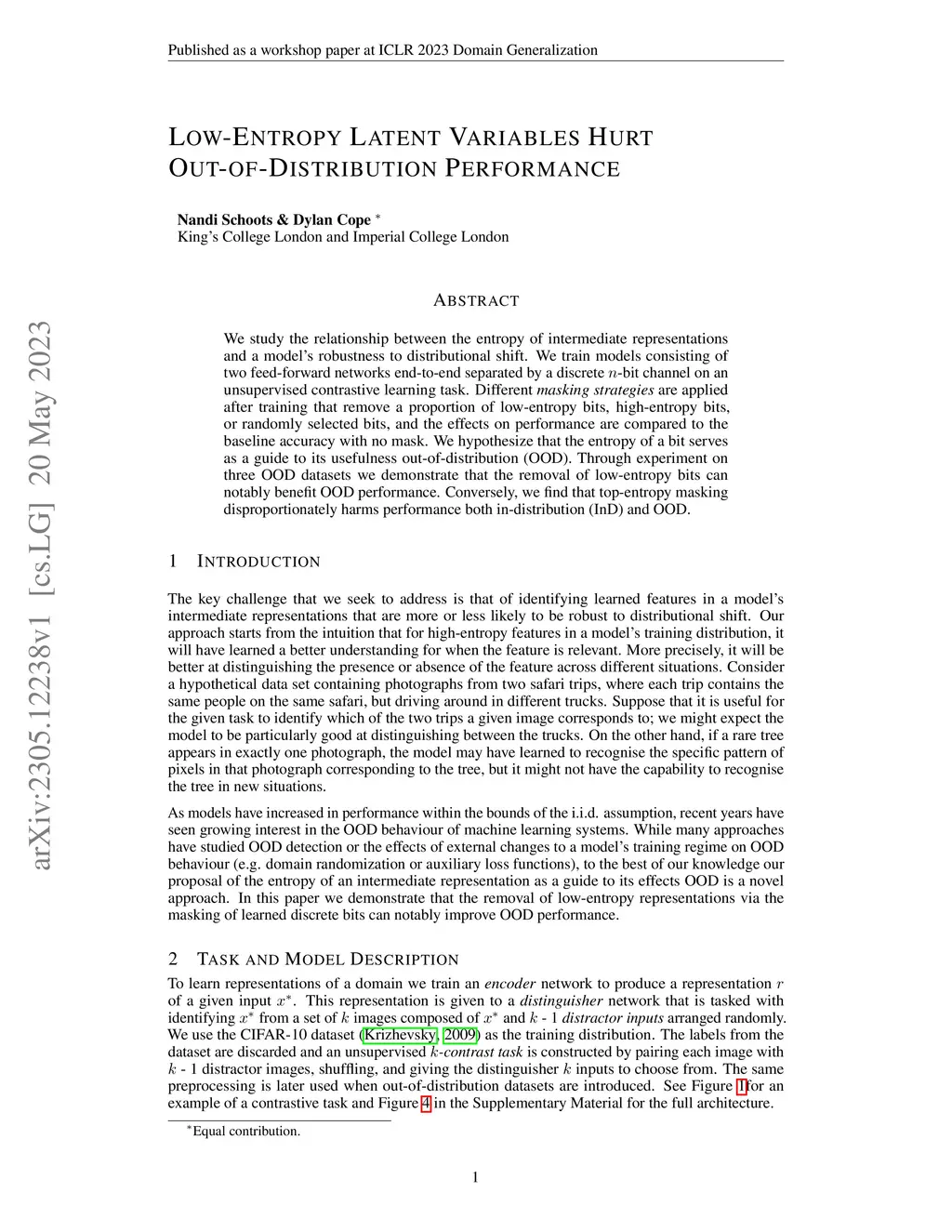 We study the relationship between the entropy of intermediate representations and a model's robustness to distributional shift. We train models consisting of two feed-forward networks end-to-end separated by a discrete -bit channel on an unsupervised contrastive learning task. Different masking strategies are applied after training that remove a proportion of low-entropy bits, high-entropy bits, or randomly selected bits, and the effects on performance are compared to the baseline accuracy with no mask. We hypothesize that the entropy of a bit serves as a guide to its usefulness out-of-distribution (OOD). Through experiment on three OOD datasets we demonstrate that the removal of low-entropy bits can notably benefit OOD performance. Conversely, we find that top-entropy masking disproportionately harms performance both in-distribution (InD) and OOD.