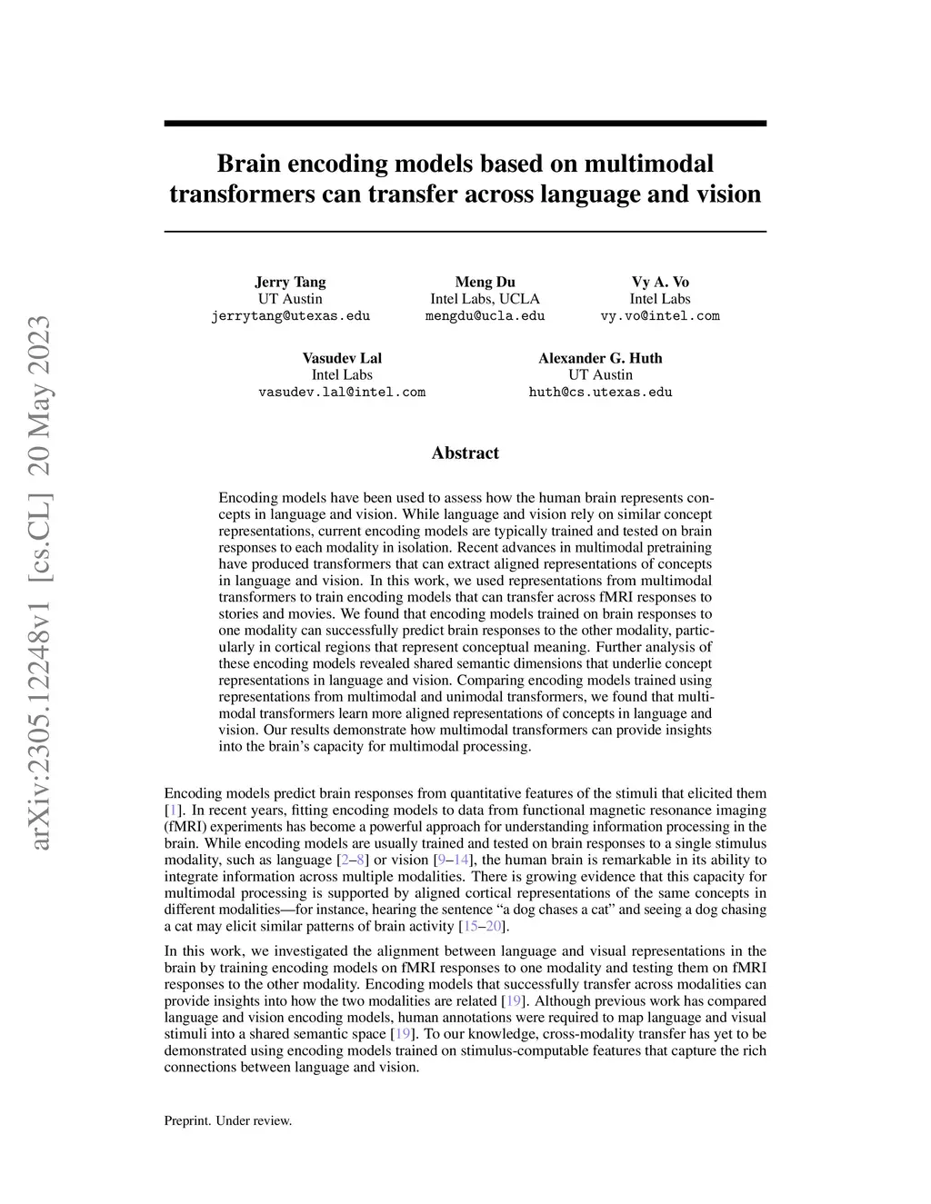 Encoding models have been used to assess how the human brain represents concepts in language and vision. While language and vision rely on similar concept representations, current encoding models are typically trained and tested on brain responses to each modality in isolation. Recent advances in multimodal pretraining have produced transformers that can extract aligned representations of concepts in language and vision. In this work, we used representations from multimodal transformers to train encoding models that can transfer across fMRI responses to stories and movies. We found that encoding models trained on brain responses to one modality can successfully predict brain responses to the other modality, particularly in cortical regions that represent conceptual meaning. Further analysis of these encoding models revealed shared semantic dimensions that underlie concept representations in language and vision. Comparing encoding models trained using representations from multimodal and unimodal transformers, we found that multimodal transformers learn more aligned representations of concepts in language and vision. Our results demonstrate how multimodal transformers can provide insights into the brain's capacity for multimodal processing.