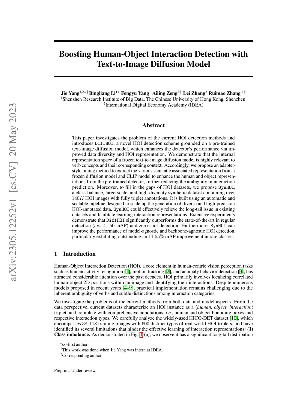 This paper investigates the problem of the current HOI detection methods and introduces DiffHOI, a novel HOI detection scheme grounded on a pre-trained text-image diffusion model, which enhances the detector's performance via improved data diversity and HOI representation. We demonstrate that the internal representation space of a frozen text-to-image diffusion model is highly relevant to verb concepts and their corresponding context. Accordingly, we propose an adapter-style tuning method to extract the various semantic associated representation from a frozen diffusion model and CLIP model to enhance the human and object representations from the pre-trained detector, further reducing the ambiguity in interaction prediction. Moreover, to fill in the gaps of HOI datasets, we propose SynHOI, a class-balance, large-scale, and high-diversity synthetic dataset containing over 140K HOI images with fully triplet annotations. It is built using an automatic and scalable pipeline designed to scale up the generation of diverse and high-precision HOI-annotated data. SynHOI could effectively relieve the long-tail issue in existing datasets and facilitate learning interaction representations. Extensive experiments demonstrate that DiffHOI significantly outperforms the state-of-the-art in regular detection (i.e., 41.50 mAP) and zero-shot detection. Furthermore, SynHOI can improve the performance of model-agnostic and backbone-agnostic HOI detection, particularly exhibiting an outstanding 11.55% mAP improvement in rare classes.