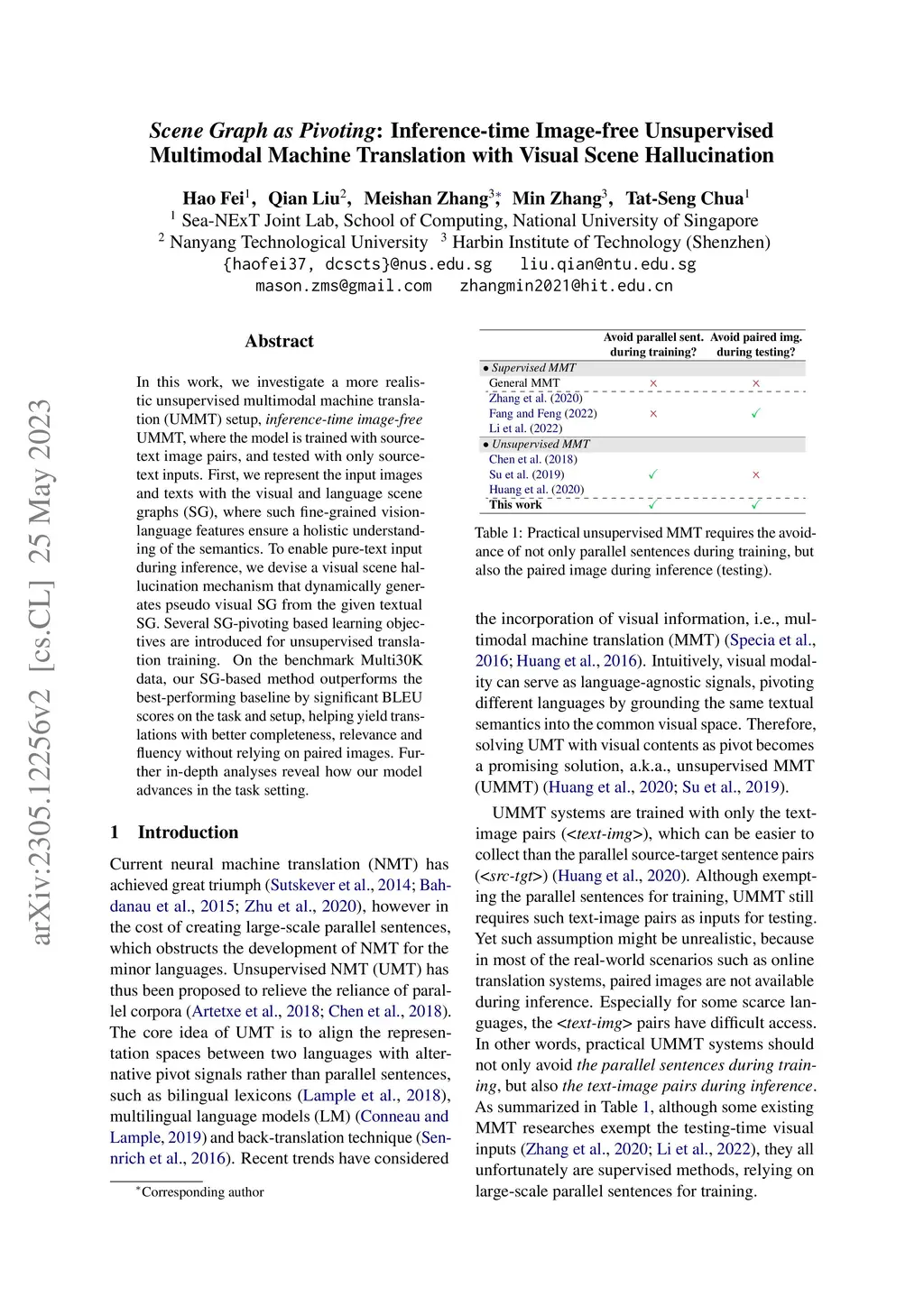In this work, we investigate a more realistic unsupervised multimodal machine translation (UMMT) setup, inference-time image-free UMMT, where the model is trained with source-text image pairs, and tested with only source-text inputs. First, we represent the input images and texts with the visual and language scene graphs (SG), where such fine-grained vision-language features ensure a holistic understanding of the semantics. To enable pure-text input during inference, we devise a visual scene hallucination mechanism that dynamically generates pseudo visual SG from the given textual SG. Several SG-pivoting based learning objectives are introduced for unsupervised translation training. On the benchmark Multi30K data, our SG-based method outperforms the best-performing baseline by significant BLEU scores on the task and setup, helping yield translations with better completeness, relevance and fluency without relying on paired images. Further in-depth analyses reveal how our model advances in the task setting.