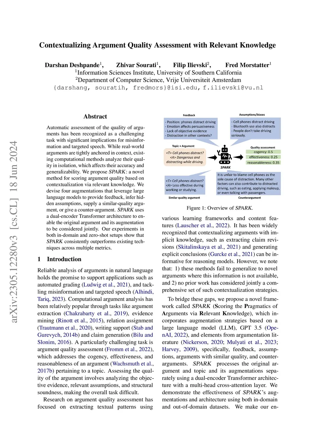 Automatic assessment of the quality of arguments has been recognized as a challenging task with significant implications for misinformation and targeted speech. While real-world arguments are tightly anchored in context, existing computational methods analyze their quality in isolation, which affects their accuracy and generalizability. We propose SPARK: a novel method for scoring argument quality based on contextualization via relevant knowledge. We devise four augmentations that leverage large language models to provide feedback, infer hidden assumptions, supply a similar-quality argument, or give a counter-argument. SPARK uses a dual-encoder Transformer architecture to enable the original argument and its augmentation to be considered jointly. Our experiments in both in-domain and zero-shot setups show that SPARK consistently outperforms existing techniques across multiple metrics.