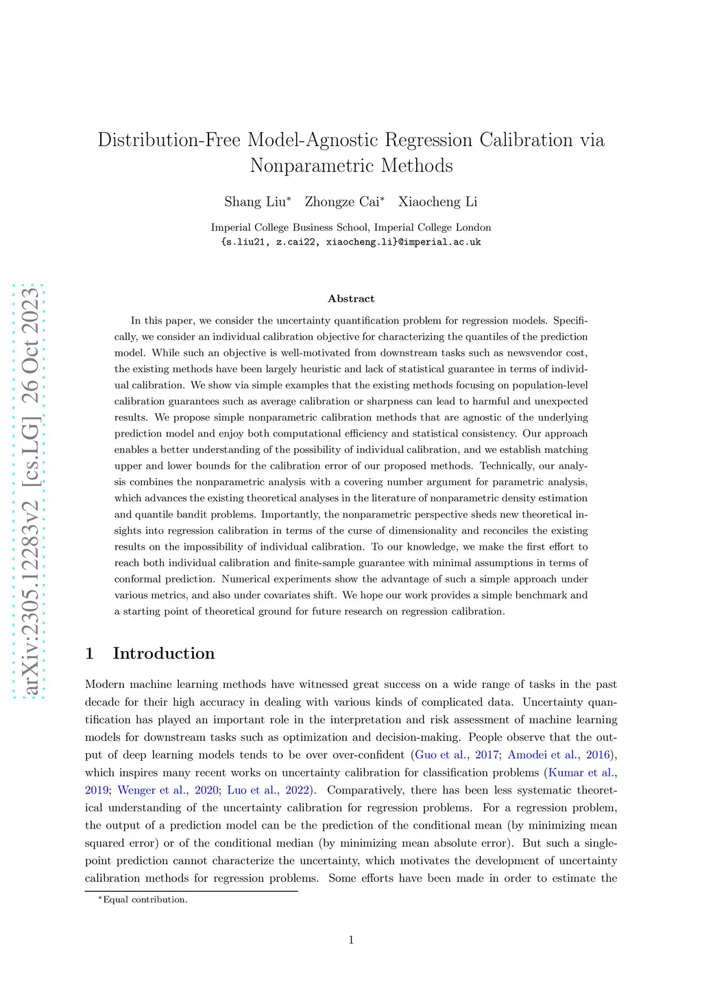 In this paper, we consider the uncertainty quantification problem for regression models. Specifically, we consider an individual calibration objective for characterizing the quantiles of the prediction model. While such an objective is well-motivated from downstream tasks such as newsvendor cost, the existing methods have been largely heuristic and lack of statistical guarantee in terms of individual calibration. We show via simple examples that the existing methods focusing on population-level calibration guarantees such as average calibration or sharpness can lead to harmful and unexpected results. We propose simple nonparametric calibration methods that are agnostic of the underlying prediction model and enjoy both computational efficiency and statistical consistency. Our approach enables a better understanding of the possibility of individual calibration, and we establish matching upper and lower bounds for the calibration error of our proposed methods. Technically, our analysis combines the nonparametric analysis with a covering number argument for parametric analysis, which advances the existing theoretical analyses in the literature of nonparametric density estimation and quantile bandit problems. Importantly, the nonparametric perspective sheds new theoretical insights into regression calibration in terms of the curse of dimensionality and reconciles the existing results on the impossibility of individual calibration. To our knowledge, we make the first effort to reach both individual calibration and finite-sample guarantee with minimal assumptions in terms of conformal prediction. Numerical experiments show the advantage of such a simple approach under various metrics, and also under covariates shift. We hope our work provides a simple benchmark and a starting point of theoretical ground for future research on regression calibration.