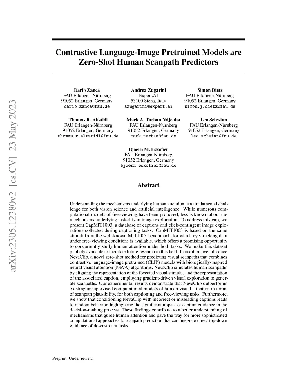 Understanding the mechanisms underlying human attention is a fundamental challenge for both vision science and artificial intelligence. While numerous computational models of free-viewing have been proposed, less is known about the mechanisms underlying task-driven image exploration. To address this gap, we present CapMIT1003, a database of captions and click-contingent image explorations collected during captioning tasks. CapMIT1003 is based on the same stimuli from the well-known MIT1003 benchmark, for which eye-tracking data under free-viewing conditions is available, which offers a promising opportunity to concurrently study human attention under both tasks. We make this dataset publicly available to facilitate future research in this field. In addition, we introduce NevaClip, a novel zero-shot method for predicting visual scanpaths that combines contrastive language-image pretrained (CLIP) models with biologically-inspired neural visual attention (NeVA) algorithms. NevaClip simulates human scanpaths by aligning the representation of the foveated visual stimulus and the representation of the associated caption, employing gradient-driven visual exploration to generate scanpaths. Our experimental results demonstrate that NevaClip outperforms existing unsupervised computational models of human visual attention in terms of scanpath plausibility, for both captioning and free-viewing tasks. Furthermore, we show that conditioning NevaClip with incorrect or misleading captions leads to random behavior, highlighting the significant impact of caption guidance in the decision-making process. These findings contribute to a better understanding of mechanisms that guide human attention and pave the way for more sophisticated computational approaches to scanpath prediction that can integrate direct top-down guidance of downstream tasks.
