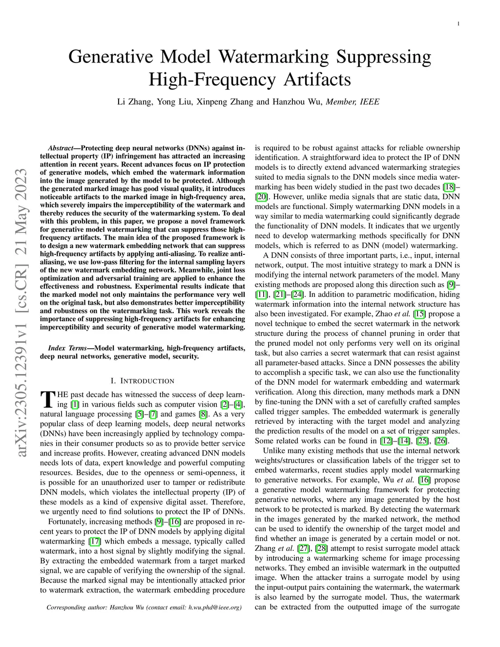 Generative Model Watermarking Suppressing High-Frequency Artifacts