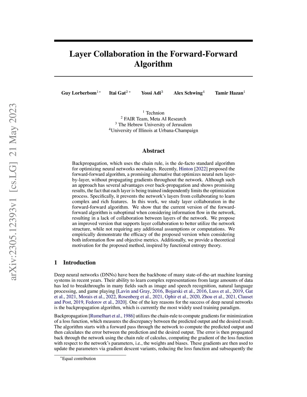 Backpropagation, which uses the chain rule, is the de-facto standard algorithm for optimizing neural networks nowadays. Recently, Hinton (2022) proposed the forward-forward algorithm, a promising alternative that optimizes neural nets layer-by-layer, without propagating gradients throughout the network. Although such an approach has several advantages over back-propagation and shows promising results, the fact that each layer is being trained independently limits the optimization process. Specifically, it prevents the network's layers from collaborating to learn complex and rich features. In this work, we study layer collaboration in the forward-forward algorithm. We show that the current version of the forward-forward algorithm is suboptimal when considering information flow in the network, resulting in a lack of collaboration between layers of the network. We propose an improved version that supports layer collaboration to better utilize the network structure, while not requiring any additional assumptions or computations. We empirically demonstrate the efficacy of the proposed version when considering both information flow and objective metrics. Additionally, we provide a theoretical motivation for the proposed method, inspired by functional entropy theory.