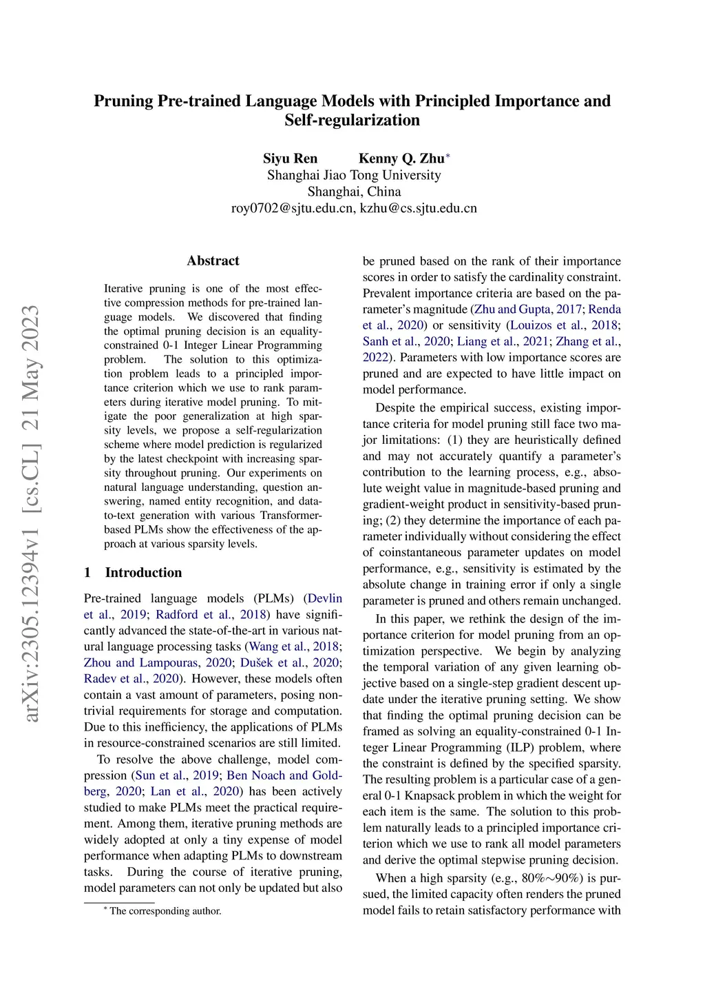 Iterative pruning is one of the most effective compression methods for pre-trained language models. We discovered that finding the optimal pruning decision is an equality-constrained 0-1 Integer Linear Programming problem. The solution to this optimization problem leads to a principled importance criterion which we use to rank parameters during iterative model pruning. To mitigate the poor generalization at high sparsity levels, we propose a self-regularization scheme where model prediction is regularized by the latest checkpoint with increasing sparsity throughout pruning. Our experiments on natural language understanding, question-answering, named entity recognition, and data-to-text generation with various Transformer-based PLMs show the effectiveness of the approach at various sparsity levels.