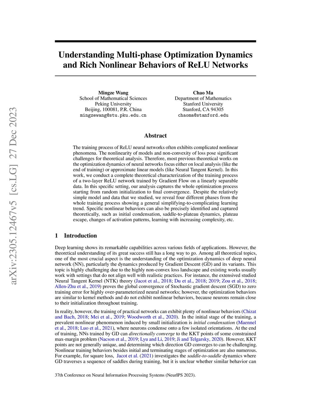 The training process of ReLU neural networks often exhibits complicated nonlinear phenomena. The nonlinearity of models and non-convexity of loss pose significant challenges for theoretical analysis. Therefore, most previous theoretical works on the optimization dynamics of neural networks focus either on local analysis (like the end of training) or approximate linear models (like Neural Tangent Kernel). In this work, we conduct a complete theoretical characterization of the training process of a two-layer ReLU network trained by Gradient Flow on a linearly separable data. In this specific setting, our analysis captures the whole optimization process starting from random initialization to final convergence. Despite the relatively simple model and data that we studied, we reveal four different phases from the whole training process showing a general simplifying-to-complicating learning trend. Specific nonlinear behaviors can also be precisely identified and captured theoretically, such as initial condensation, saddle-to-plateau dynamics, plateau escape, changes of activation patterns, learning with increasing complexity, etc.
