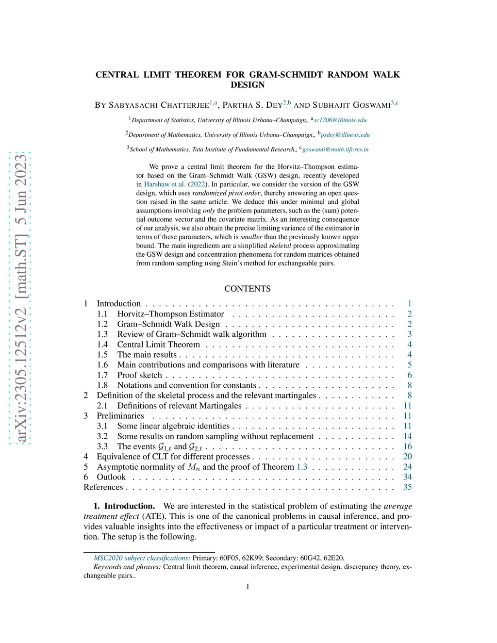 We prove a central limit theorem for the Horvitz-Thompson estimator based on the Gram-Schmidt Walk (GSW) design, recently developed in Harshaw et al.(2022). In particular, we consider the version of the GSW design which uses randomized pivot order, thereby answering an open question raised in the same article. We deduce this under minimal and global assumptions involving only the problem parameters such as the (sum) potential outcome vector and the covariate matrix. As an interesting consequence of our analysis we also obtain the precise limiting variance of the estimator in terms of these parameters which is smaller than the previously known upper bound. The main ingredients are a simplified skeletal process approximating the GSW design and concentration phenomena for random matrices obtained from random sampling using the Stein's method for exchangeable pairs.